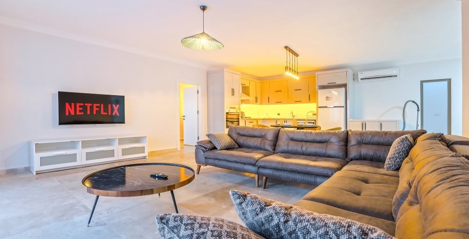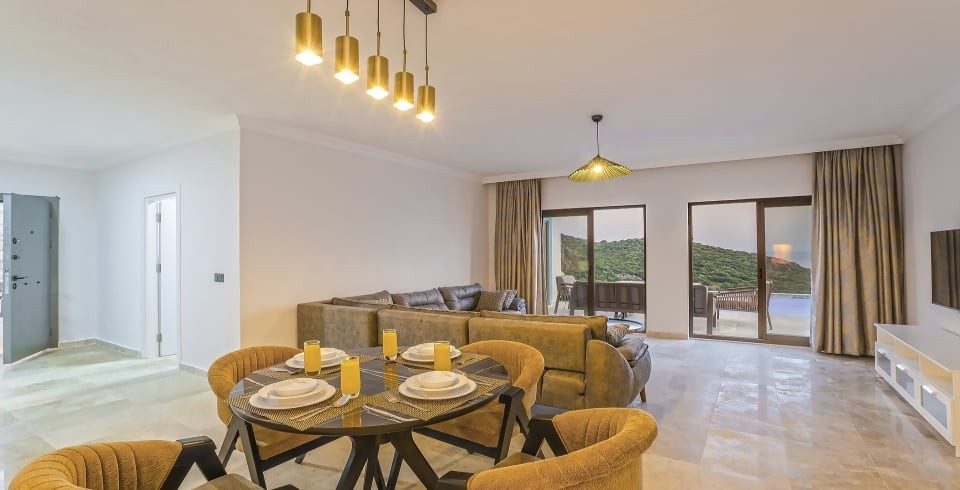 Salon : villamızın salon kısmında; Oturma grubu, televizyon, klima, sehpa, internet ve havuz terasına çıkış bulunmaktadır.