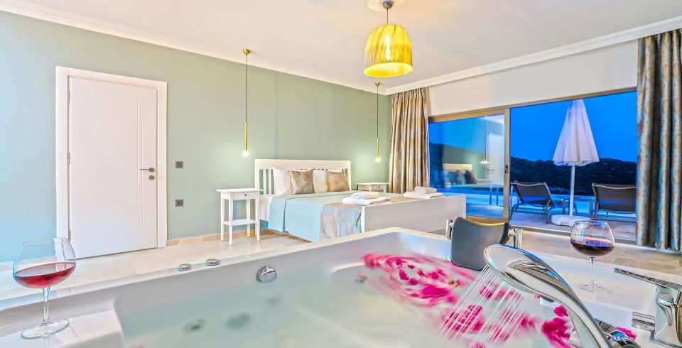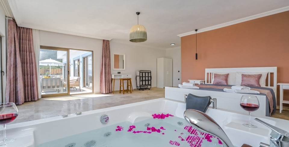 1. Yatak Odası: 1 Adet çift kişilik yatak, klima, elbise dolabı, komodin, makyaj masası, jakuzi, tuvalet ve banyo bulunmaktadır.