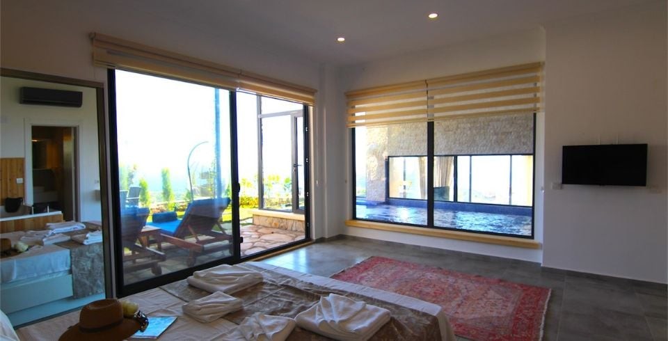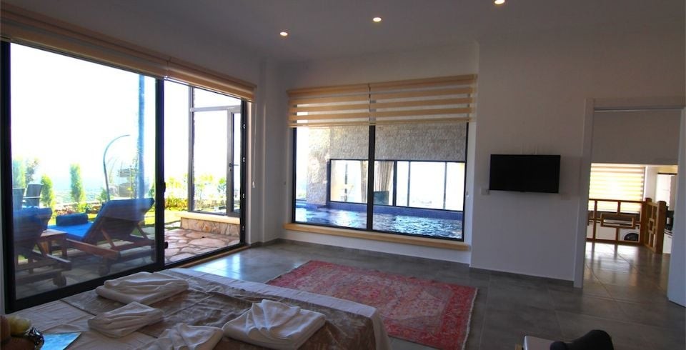 Salon : Villa North Star’ın salonunda sizi şık bir oturma grubu ile klima, televizyon, internet, uydu, koltuk, sehpa ile ferah bir salon bekliyor olacaktır. Havuz terasına çıkış yapılmaktadır.