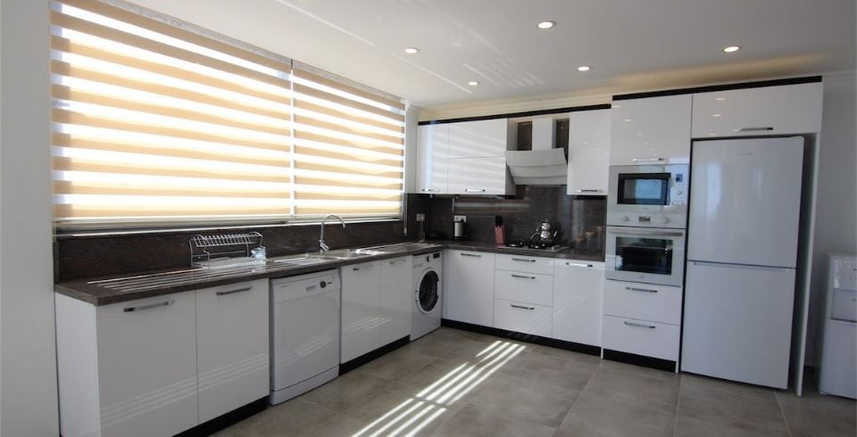 Mutfak : Villamızın geniş Amerikan mutfağı ile sizlere kendi evinizin mutfağı gibi hissettirecek. Ayrıca mutfakta klima, bulaşık makinası, buzdolabı, çamaşır makinası, mikrodalga fırın, tost makinası, ekmek kızartma, su ısıtıcısı, fırın, 4'lü ocak seti ve 2 kişilik geniş yemek masası ile tava tencere vb. mutfak araç gereçlerini kullanma fırsatını sizlere sunuyoruz.