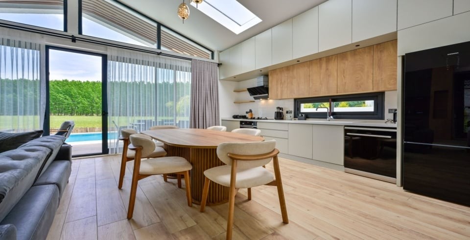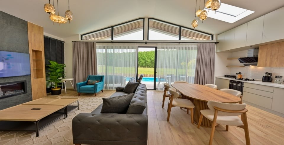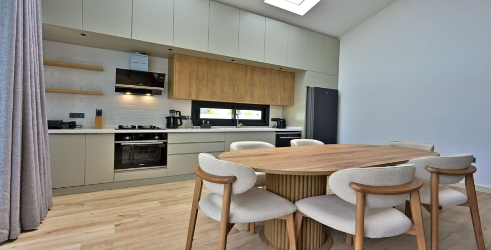Mutfak: Açık planlı mutfak, 6 kişiye yetecek kadar mutfak malzemeleri, buzdolabı, fırın, ocak, mikrodalga fırın, bulaşık makinesi, çamaşır makinesi, tost makinesi, kettle ve çaydanlık bulunmaktadır..