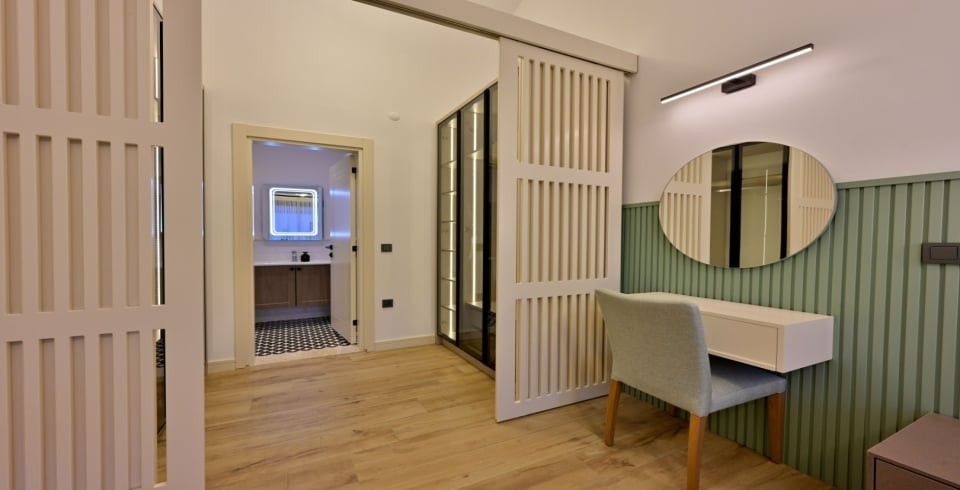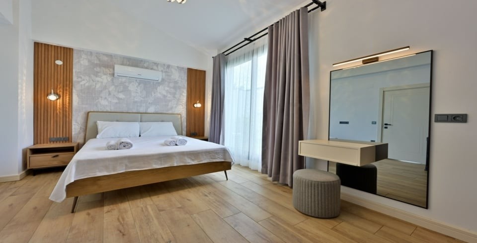 1.Yatak Odası:  1 adet çift kişilik yatak, elbise dolabı, komodin, makyaj masası, klima, banyo ve lavabo bulunmaktadır.