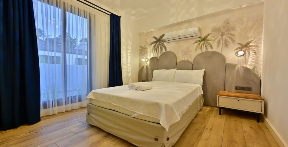 3.Yatak Odası:  1 adet çift kişilik yatak, elbise dolabı, komodin, makyaj masası, klima, TV, ortak banyo ve lavabo bulunmaktadır.