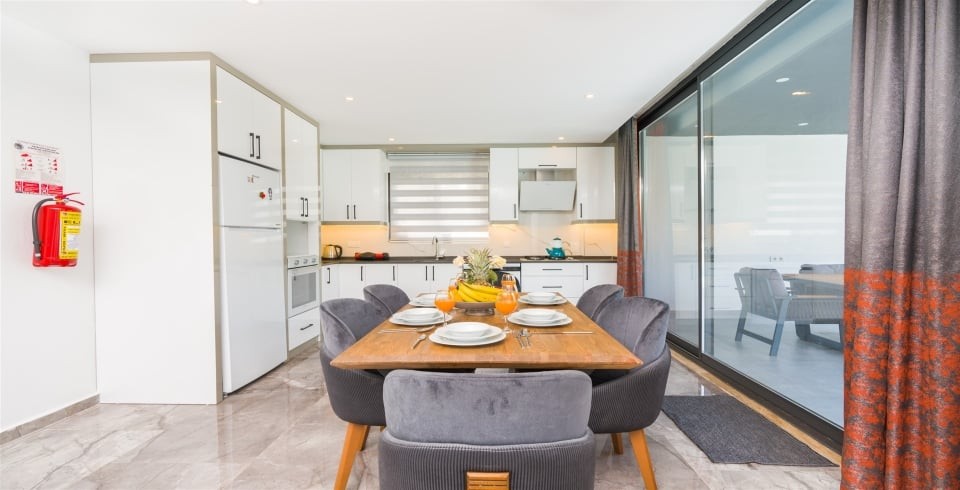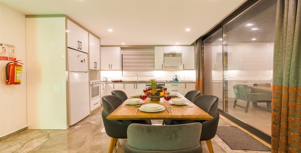 Mutfak : Modern Amerika mutfağımızda yemek masası, buzdolabı, tost makinası, fırın, 4’lü ocak, elektrikli su ısıtıcısı, çatal-bıçak takımı, tencere-tava takımı, bulaşık makinesi çamaşır makinesi, bulunmaktadır.