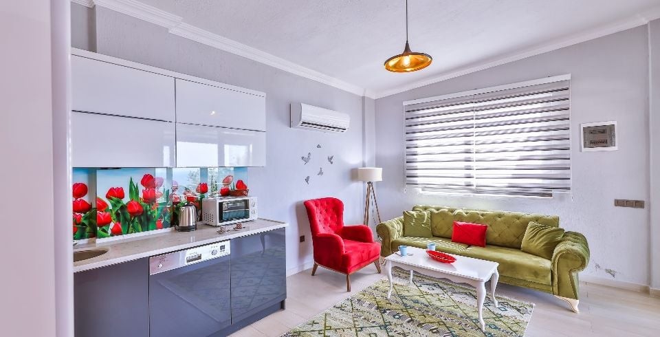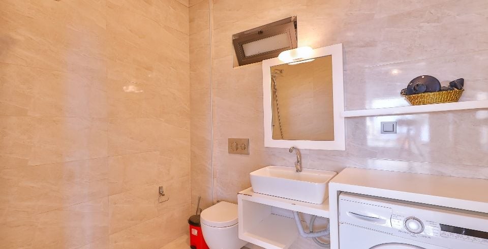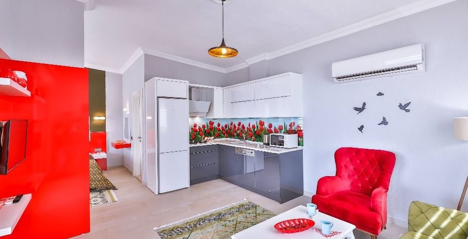 Mutfak : Şık kırmızılarla dizayn edilmiş modern Amerikan mutfağımızın içerisinde buzdolabı, bulaşık makinesi, çamaşır makinesi, ankastre fırın, mikrodalga fırın, ankastre 4’lü ocak, çay, kahve keyifleriniz için elektrikli su ısıtıcısı dört kişilik yemek takımı ile beraber diğer mutfak gereçleri, tava, tencereler, çatal, bıçak vs. bulunuyor.