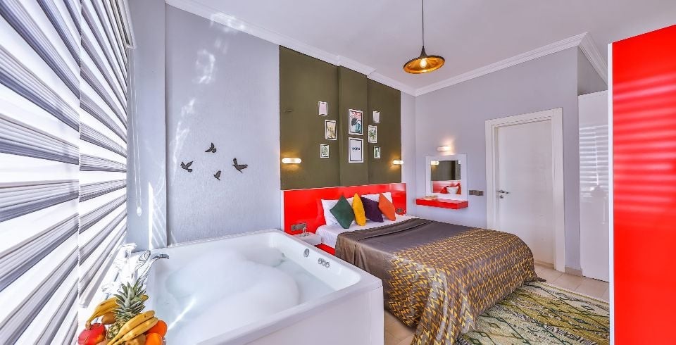 1. Yatak Odası : Yatak odamız süit oda olup içerisinde 1 adet çift kişilik yatak ve eşinizle geçireceğiniz jakuzi keyifleriniz için güzel bir jakuzi bulunuyor. Aynı zamanda odada  elbise dolabı, temiz banyo ve tuvalet bulunuyor.