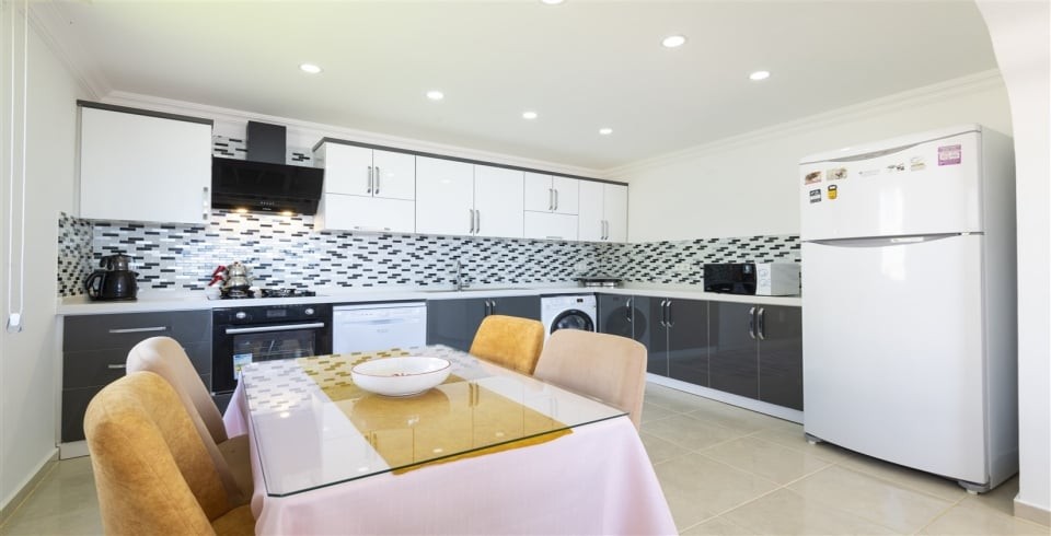 Mutfak : Villamızın geniş Amerikan mutfağı ile sizlere kendi evinizin mutfağı gibi hissettirecek. Ayrıca mutfakta klima, bulaşık makinası, buzdolabı, çamaşır makinası, mikrodalga fırın, tost makinası, ekmek kızartma, su ısıtıcısı, fırın, 4`lü ocak seti ve 4 kişilik geniş yemek masası ile tava tencere vb. mutfak araç gereçlerini kullanma fırsatını sizlere sunuyoruz.