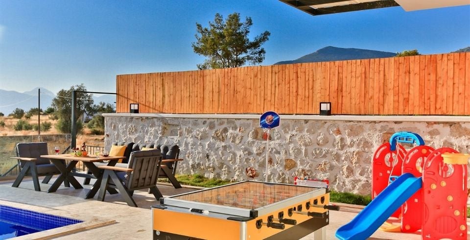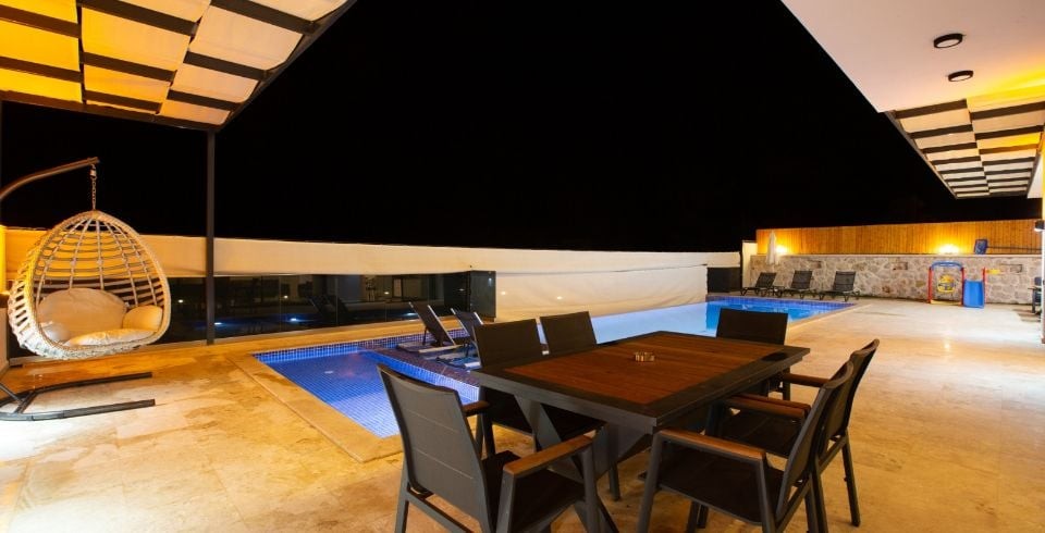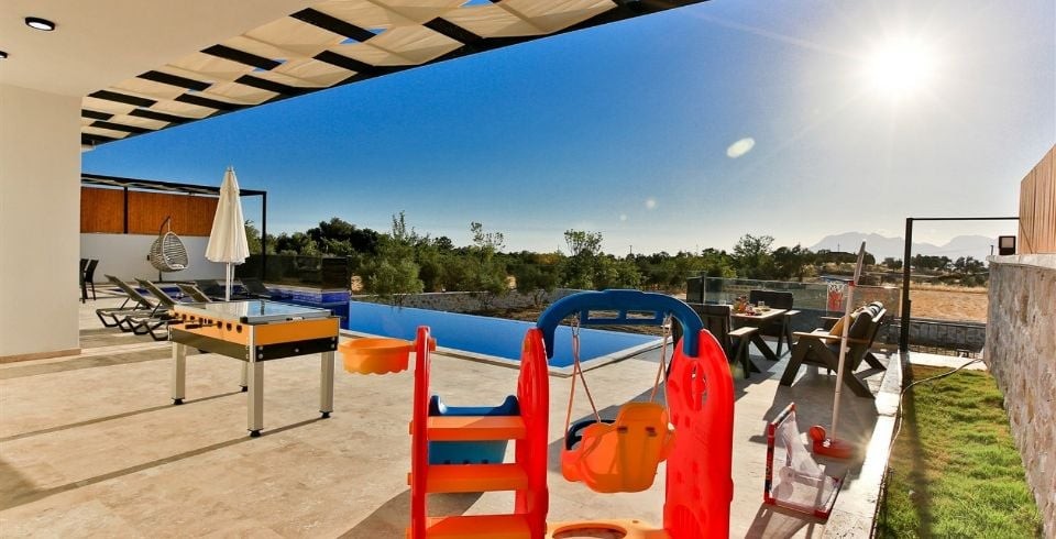 Havuz ve Bahçe : Bahçe içerisinde özel yüzme havuzu, şezlonglar, güneş şemsiyesi, salıncak, oyun parkı langırt bahçe yemek masası bulunmaktadır.