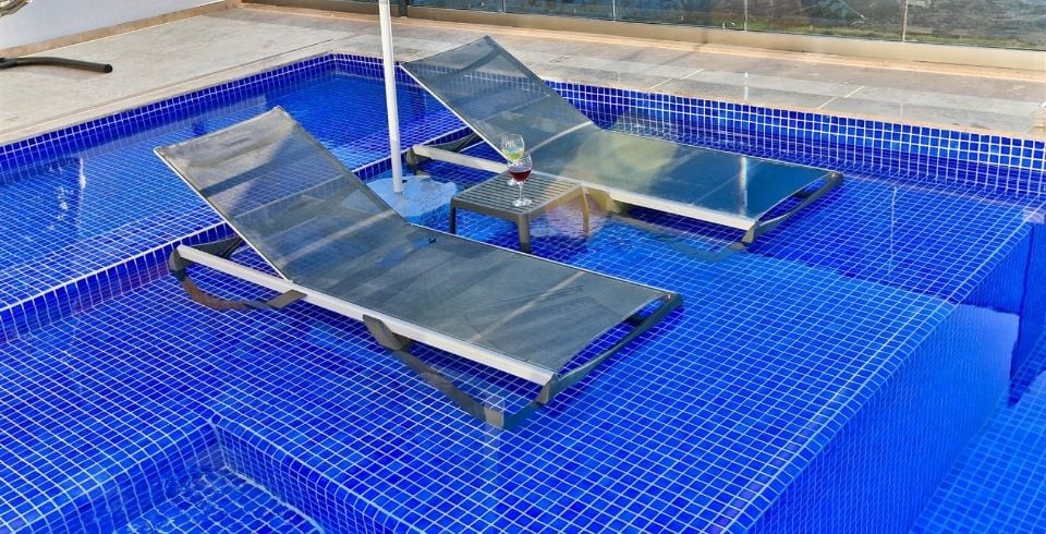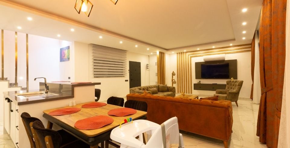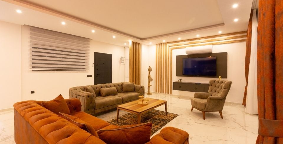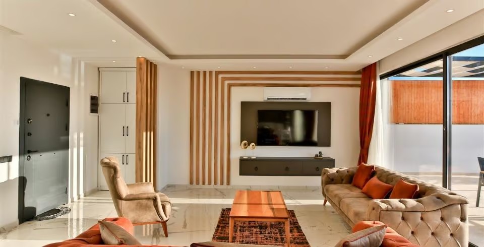 Salon : Salon içerisinde oturma grubu, TV, klima, sehpa bulunmaktadır. Havuz terasına çıkış yapılabilmektedir.