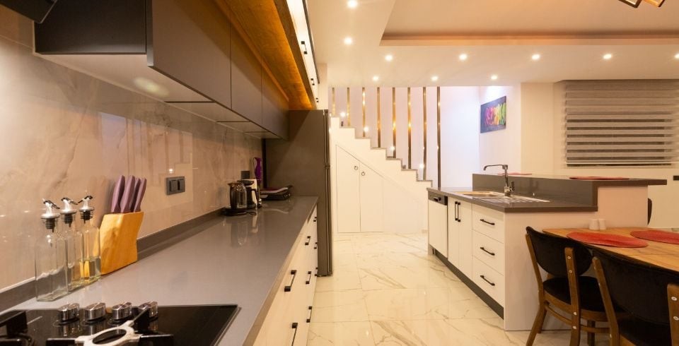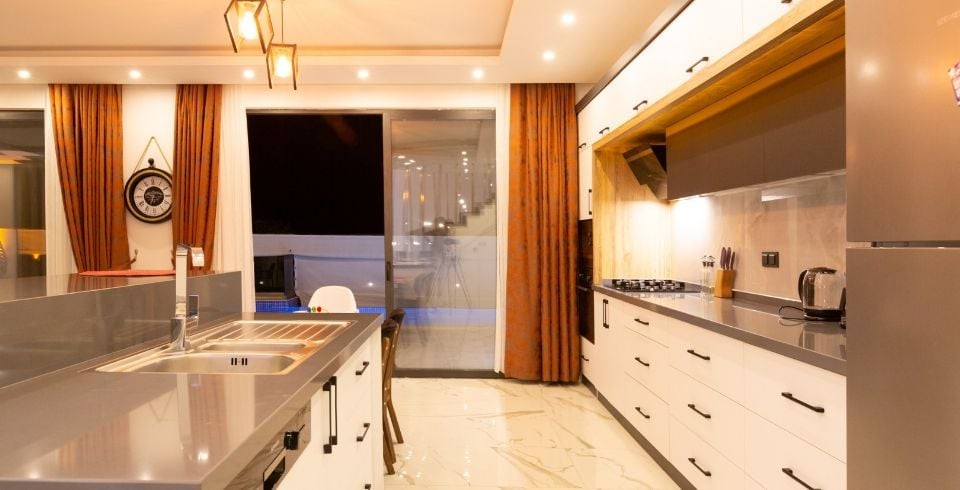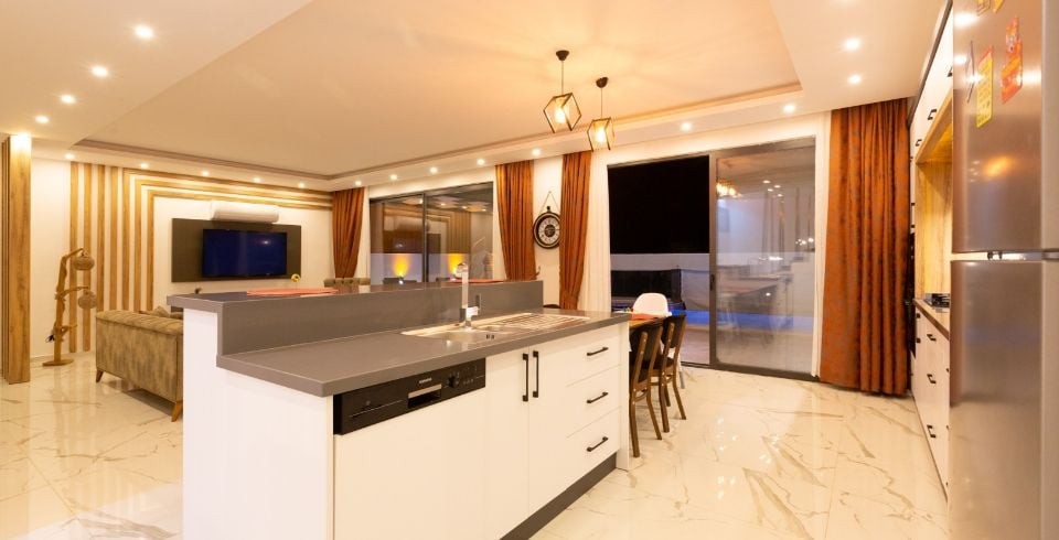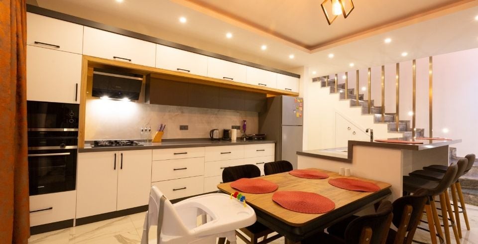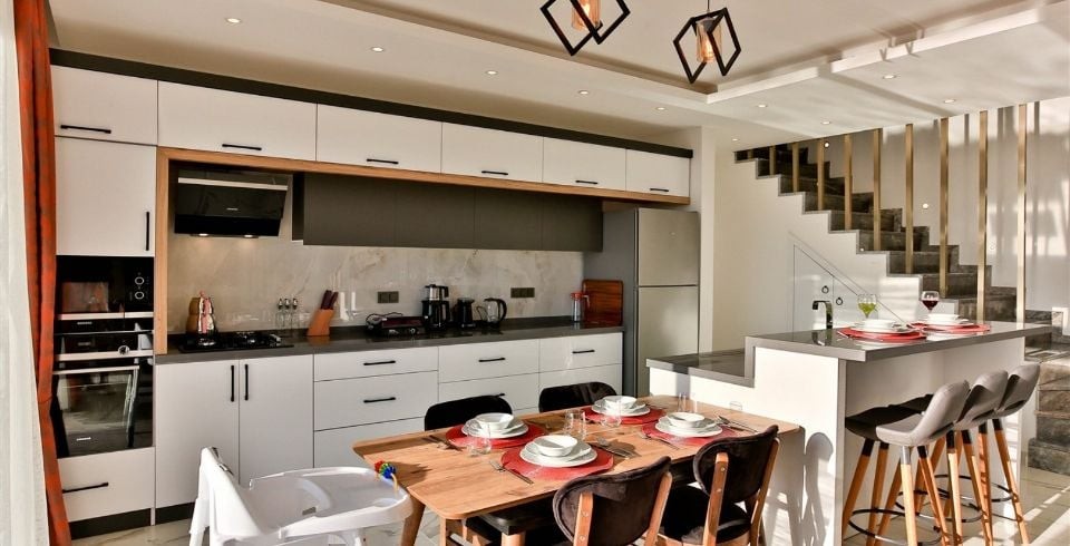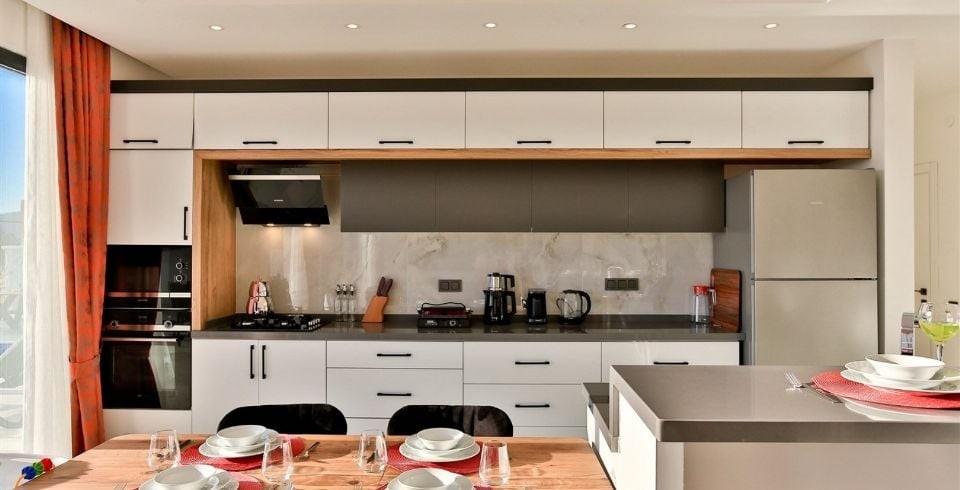 Mutfak : Modern Amerikan mutfakta buzdolabı, bulaşık makinası, fırın, ocak, mikrodalga fırın, tost makinası, kettle, yemek masası, yemek takımları, çatal ve bıçak takımları, tencere ve tava takımları, bardaklar bulunmaktadır.