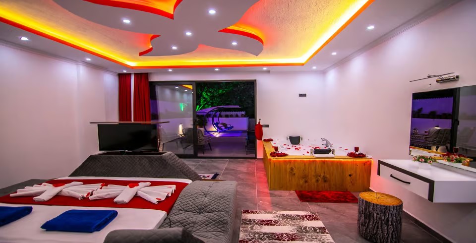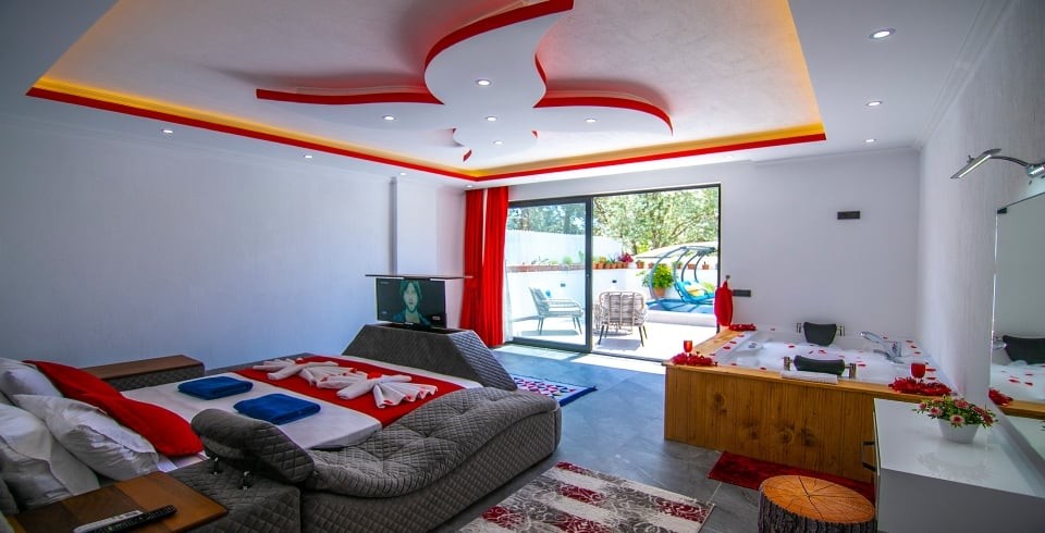1. Yatak Odası : Çift kişilik yatak, klima, komodin, jakuzi, TV, makyaj masası, elbise dolabı, banyo ve lavabo bulunmaktadır.