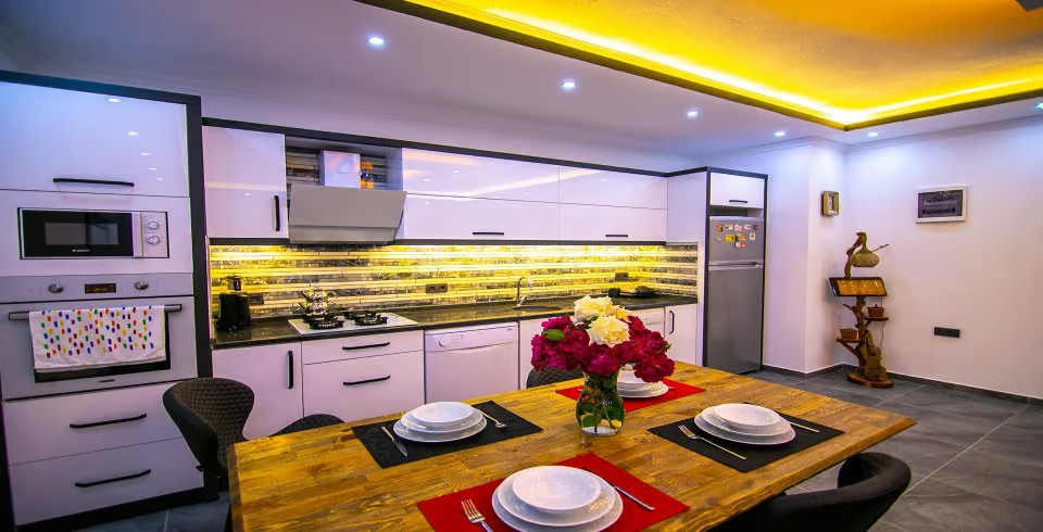 Mutfak : Modern Amerika mutfağımızda yemek masası, buzdolabı, çamaşır makinesi, mikrodalga fırın, 4’lü ocak, tost makinesi, elektrikli su ısıtıcısı, çatal-bıçak takımı, tencere-tava takımı, bulaşık makinesi bulunmaktadır.