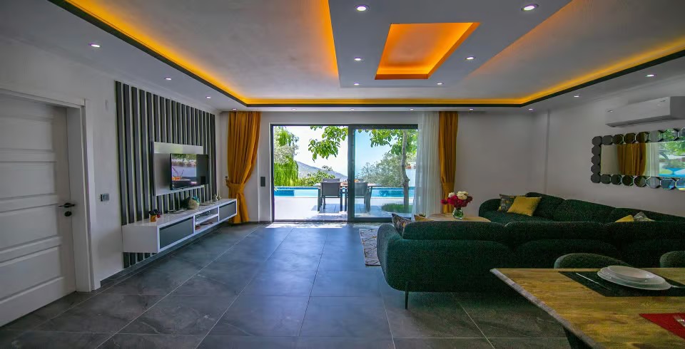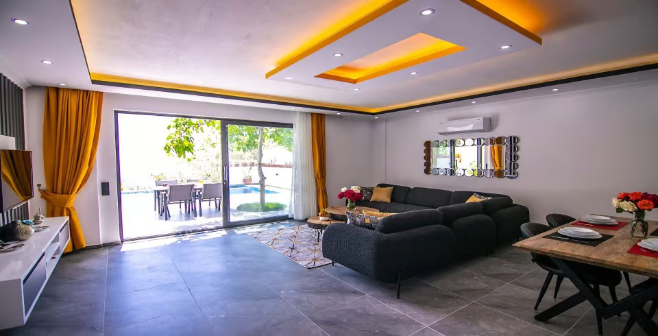 Salon : Villamızın iç dizaynı da son modaya uygun olarak modern bir şekilde tasarlanmıştır. Çeşitli dekoratif eşyalarla süslediğimiz salonumuz havuzlu bahçeye açılıyor. Villa salonunda oturma grubu, TV, internet, klima, sehpa bulunmaktadır.