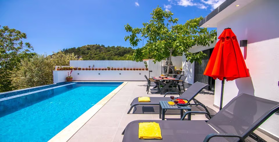 Havuz ve Bahçe : Villamız korunaklı olduğundan dışarıdan kesinlikle görünmemektedir. 1.55 santimetre sığ özel yüzme havuzunun içinde şezlong bulunan bahçemizde ekstra şezlonglar, şemsiye, yemek masası, salıncak ve barbekü alanı bulunmaktadır.