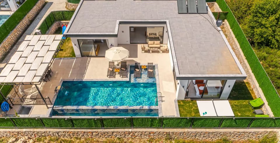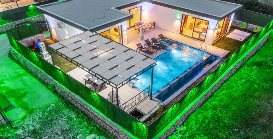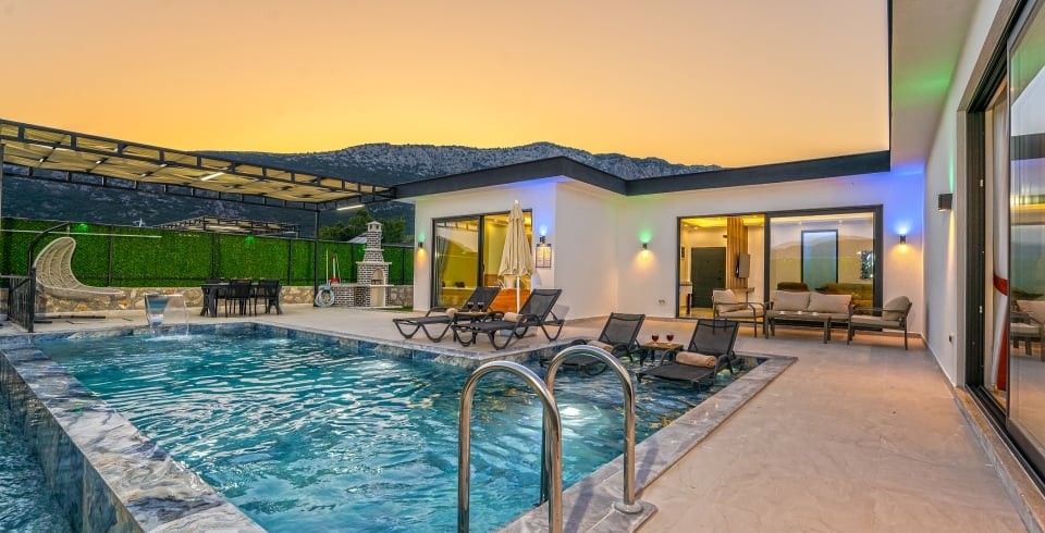 Havuz ve Bahçe : Özel yüzme havuzu bulunan villamızın havuz terasında şemsiye, şezlong, barbekü, oturma alanı, yemek masası ve sandalyeler bulunmaktadır.