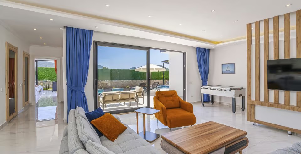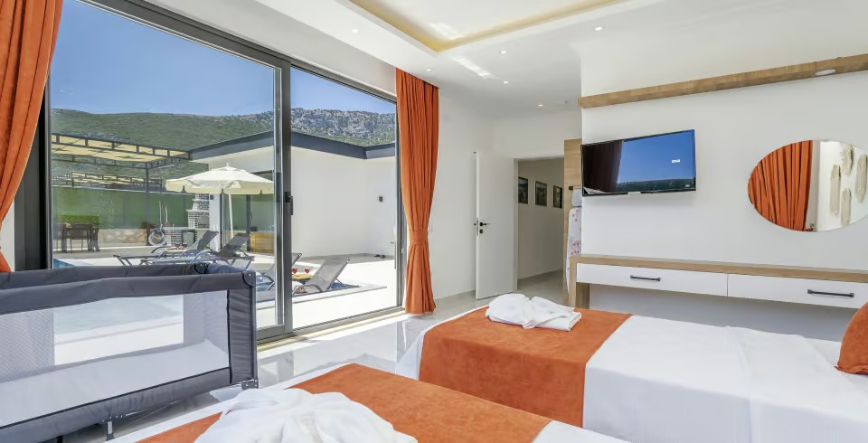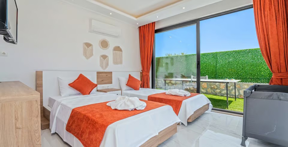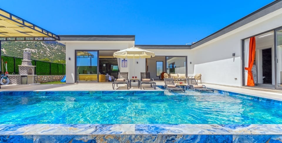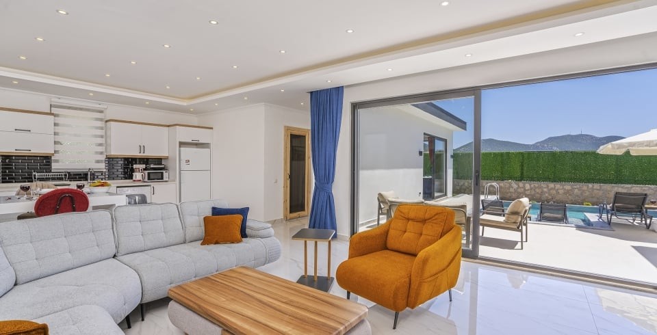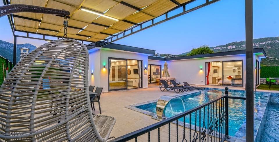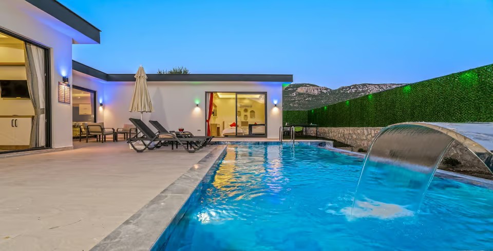 Villa Ortaç 5, Kalkan’ın doğal güzellikleriyle öne çıkan Bezirgan bölgesinde yer alan, 2 yatak odalı ve 4 kişilik konaklama kapasitesine sahip lüks bir kiralık villadır.