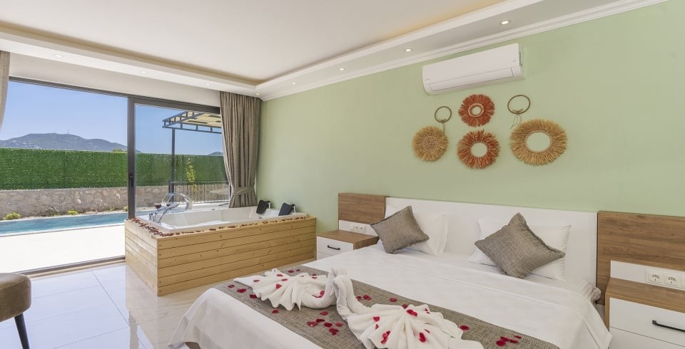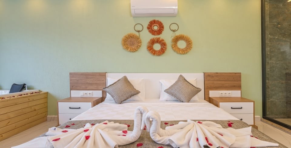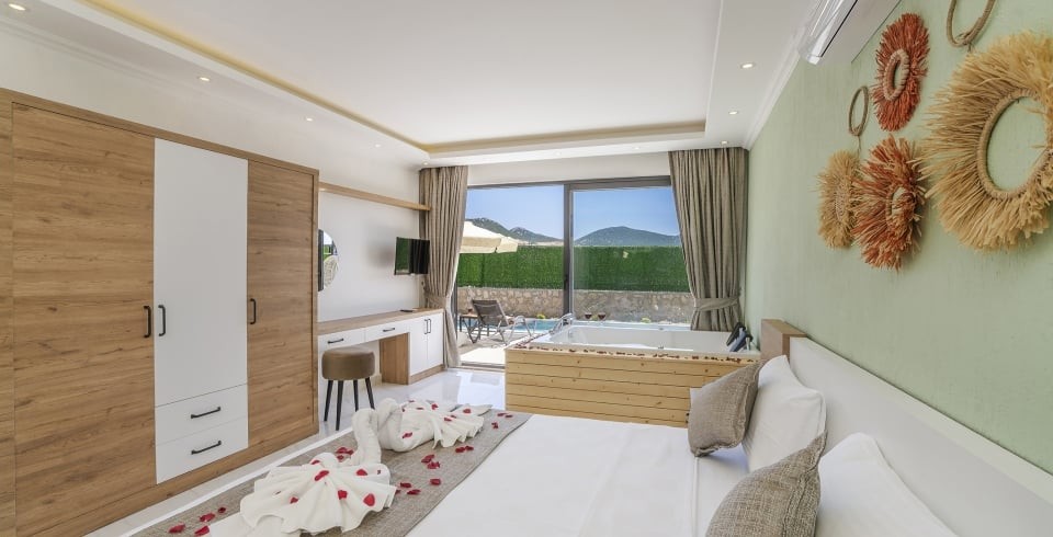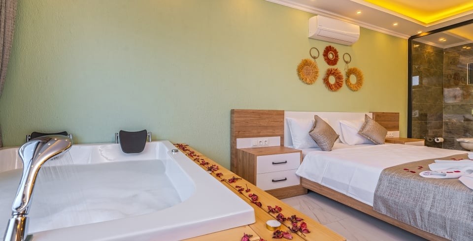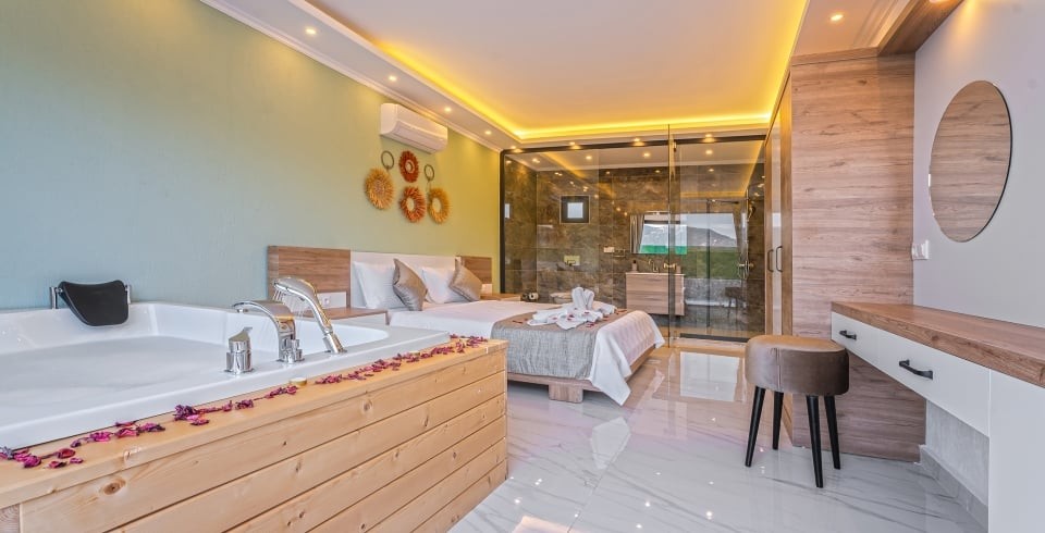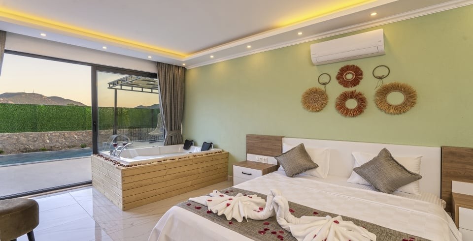 1. Yatak Odası : 1 adet çift kişilik yatak, TV, klima, komodin, makyaj masası, elbise dolabı, jakuzi ve banyo tuvalet bulunmaktadır.