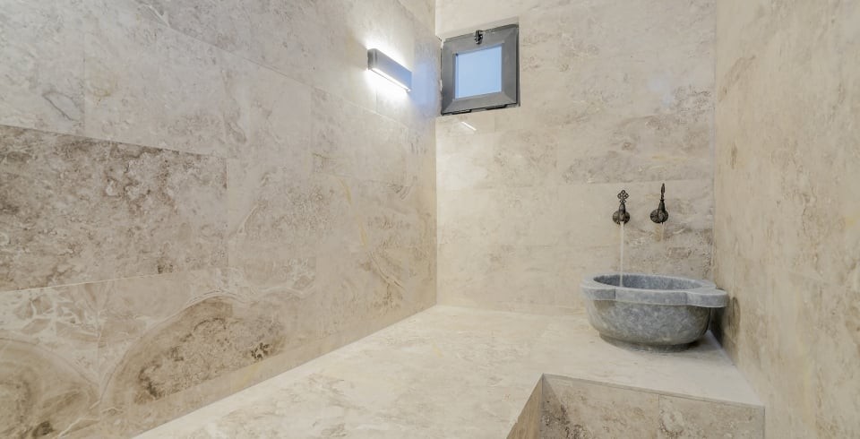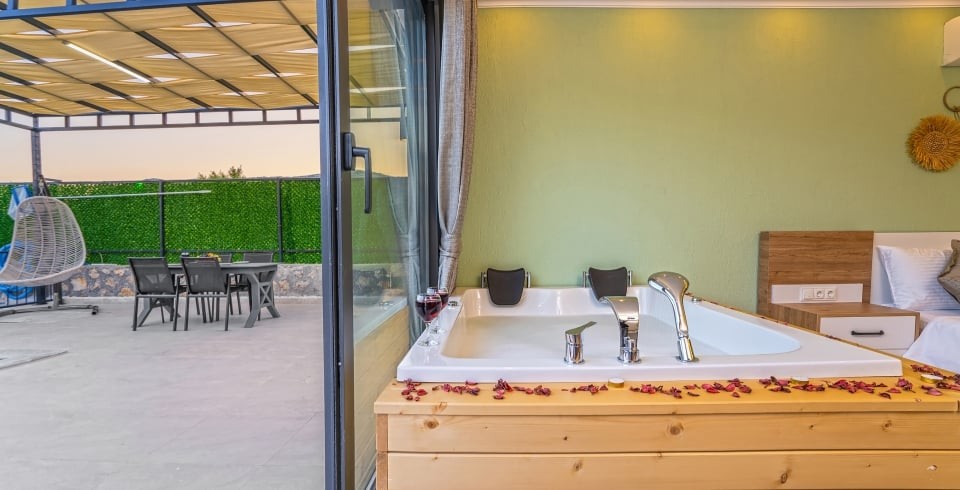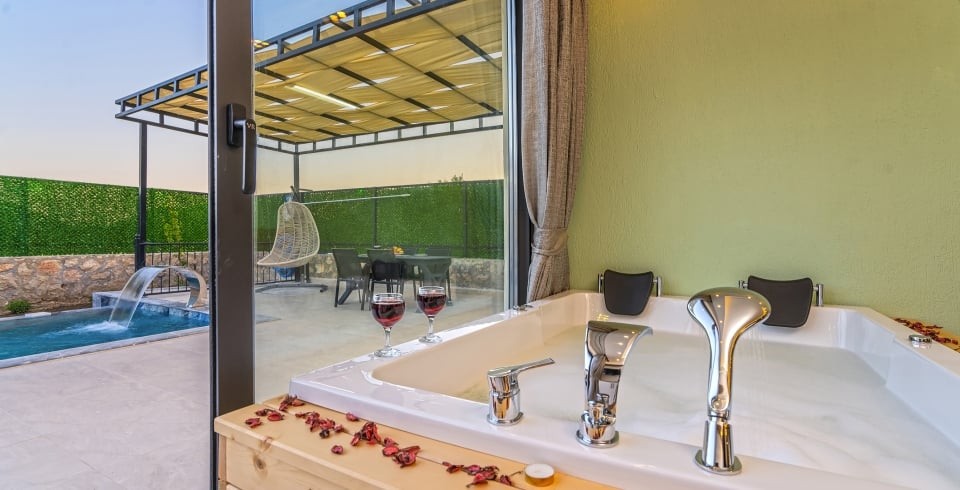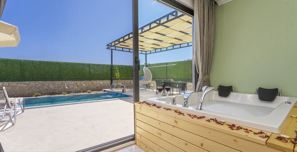 Villanın havuz terası muhafazakar olup dışarıdan görünmemektedir; bu özelliğiyle özellikle gizliliğe önem veren misafirlerimiz için uygundur. Geniş iç mekanı, hamam, sauna ve jakuzi gibi lüks olanaklarıyla yılın tüm yorgunluğunu atmanızı sağlar.