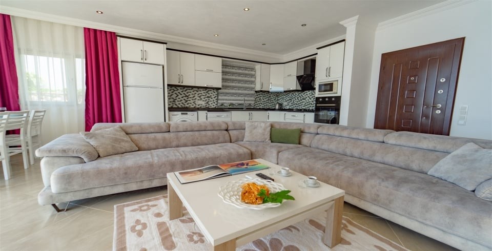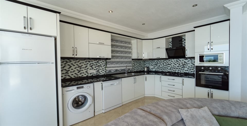 Mutfak : Yemek yapmaktan hoşlanmayan misafirlerimiz bile manzara karşısında kendilerini yemek hazırlarken bulabilirler. Manzara hem iştahınızı açacak hem de yemek yapma hevesinizi getirecektir. Modern Amerikan mutfağımızda buzdolabı, bulaşık makinesi, çamaşır makinesi, ankastre fırın, mikrodalga fırın, ankastre 4’lü ocak, elektrikli su ısıtıcısı, 4 kişilik yemek takımı ve eksiksiz çeşitli mutfak araç-gereçleri bulunmaktadır.