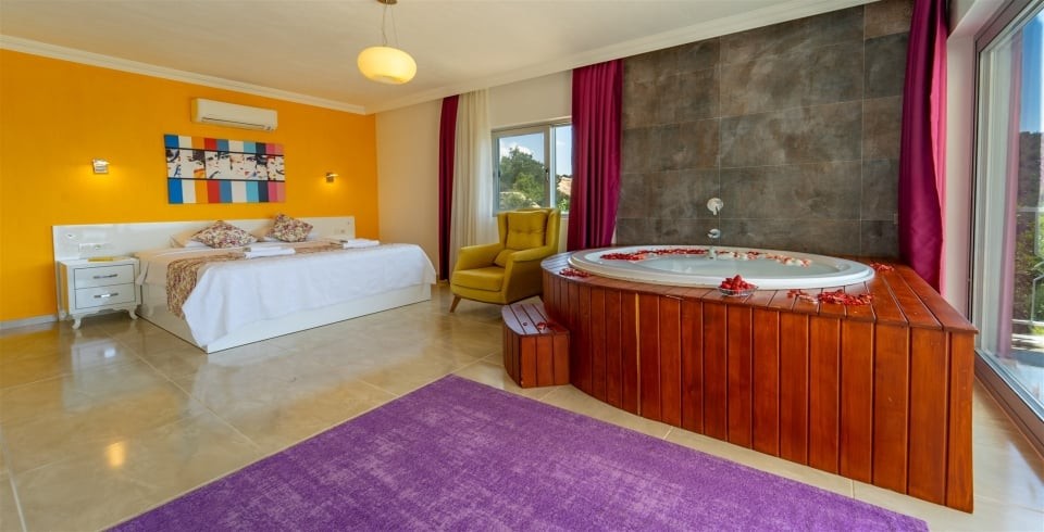 1. Yatak Odası : İçerisinde jakuzi bulunan süit odamızda jakuzi bulunmaktadır. 1 adet çift kişilik yatak, elbise dolabı, klima, banyo ve lavabo bulunmaktadır.