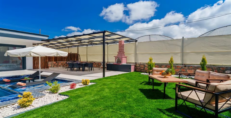 Bahçe : Villamızın bahçesinde özel yüzme havuzu, güneşlenmeniz için şezlong, 5 kişilik masa, oturma grubu, mangal keyfiniz için barbekü, güneş şemsiyesi bulunmaktadır.