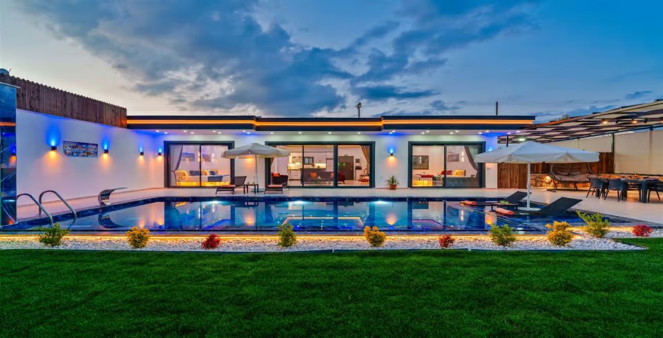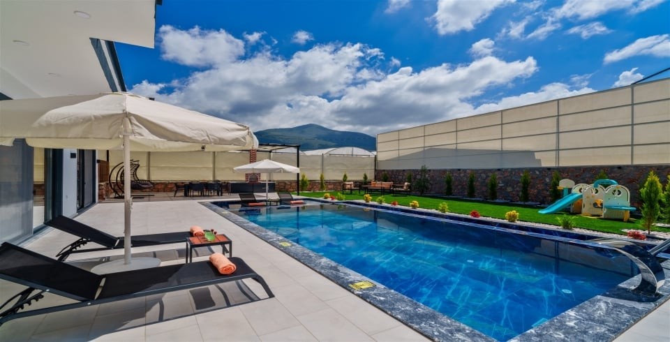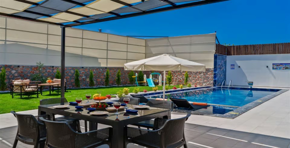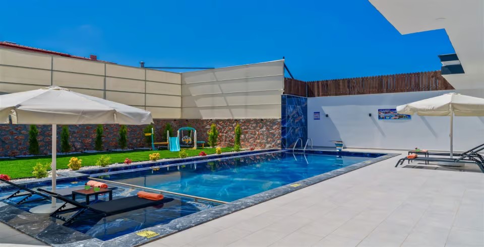 Muhafazakar yapısıyla korunaklı olan villa, dışarıdan görünmeyen özel havuzu sayesinde misafirlerine mahremiyet sağlıyor. Ana havuza ek olarak çocuklar için özel bir çocuk havuzu ve eğlenceli vakit geçirebilecekleri çocuk oyun alanı da mevcut. Geniş ve yemyeşil bahçesi, sevdiklerinizle keyifli vakit geçirmeniz için özenle tasarlandı.