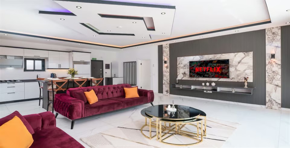 Salon : Villanın salonunda sizi şık bir oturma grubu ile klima, televizyon, internet, uydu, koltuk, sehpa ile ferah bir salon bekliyor olacaktır. Havuz terasına çıkış yapılmaktadır.