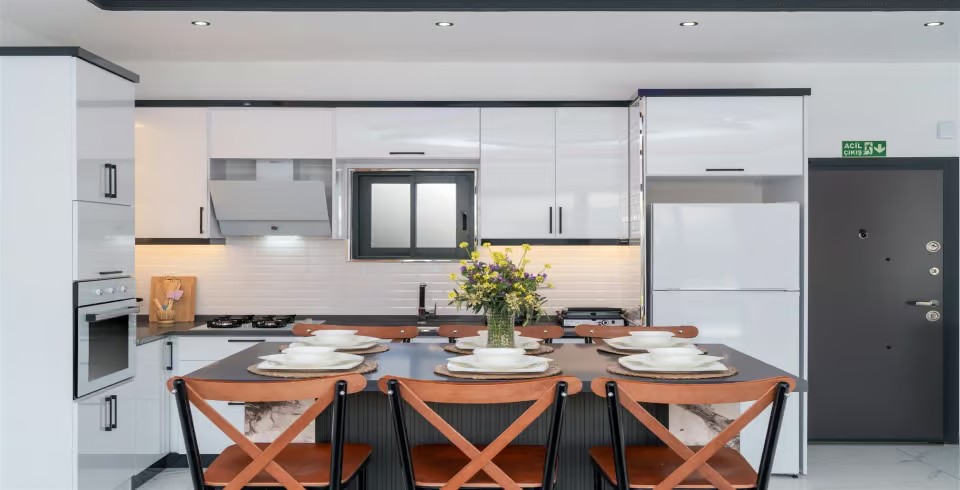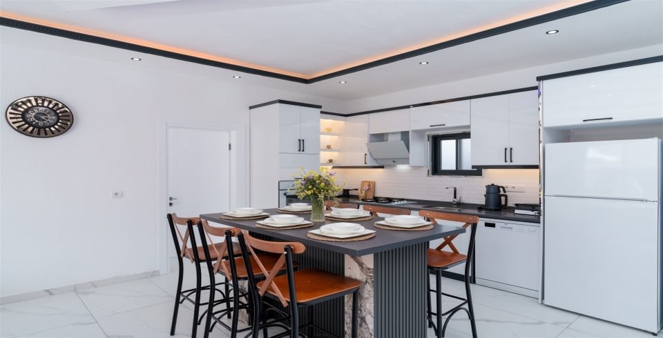 Mutfak : Villamızın geniş Amerikan mutfağı ile sizlere kendi evinizin mutfağı gibi hissettirecek. Ayrıca mutfakta klima, bulaşık makinası, buzdolabı, çamaşır makinası, mikrodalga fırın, tost makinası, ekmek kızartma, su ısıtıcısı, fırın, 4`lü ocak seti ve 4 kişilik geniş yemek masası ile tava tencere vb. mutfak araç gereçlerini kullanma fırsatını sizlere sunuyoruz.