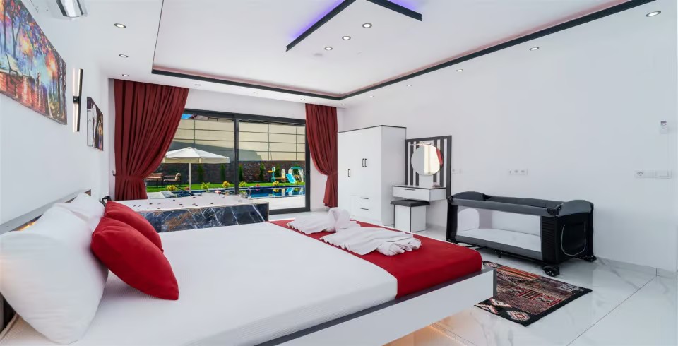 1. Yatak Odası : 1 adet çift kişilik yatak, klima, jakuzi, komodin, elbise dolabı, makyaj masası, banyo ve lavabo bulunmaktadır.