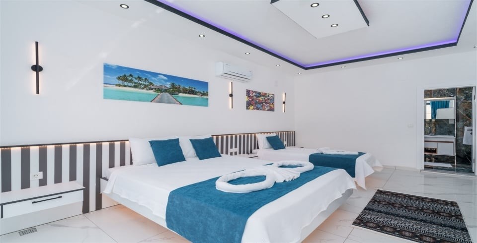 2. Yatak Odası : 1 adet çift kişilik, 1 adet tek kişilik yatak, klima, elbise dolabı, makyaj masası, komodin, banyo ve lavabo bulunmaktadır.