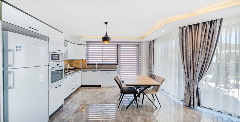 Mutfak: Amerikan açık mutfak, bulaşık makinası, buzdolabı, çamaşır makinası,  su ısıtıcısı, fırın, 4'lü ocak seti, yemek masası ve mutfak araç gerekleri 4 kişilik olarak mevcuttur.