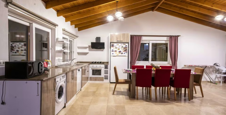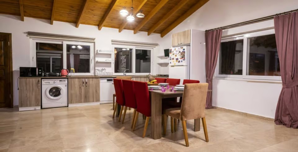 Salon : Ferah ve şık dizayn edilmiş Amerikan Mutfak , Buzdolabı , Bulaşık Makinesi , Çamaşır Makinesi , Fırın , Ocak , Mikrodalga Fırın , Elektrikli Su Isıtıcısı , Tost Makinesi , Tava Tencere vb. Mutfak Ekipmanları