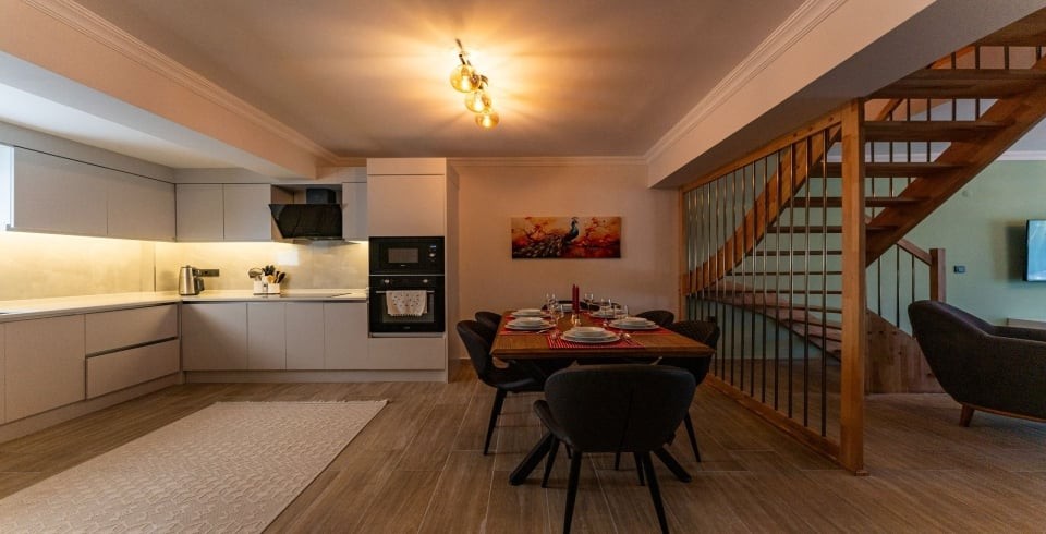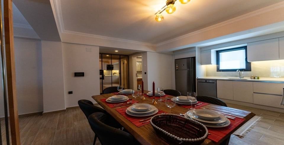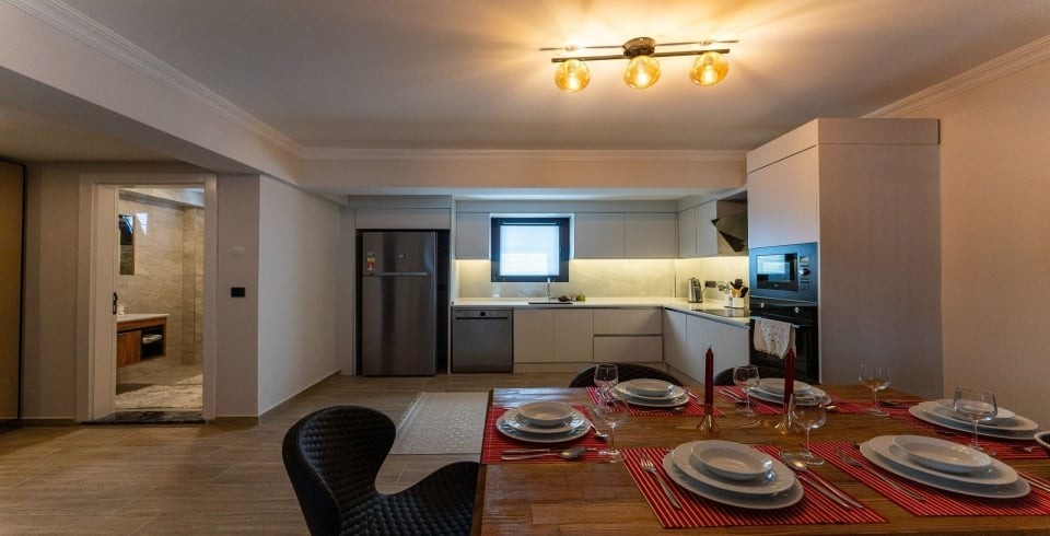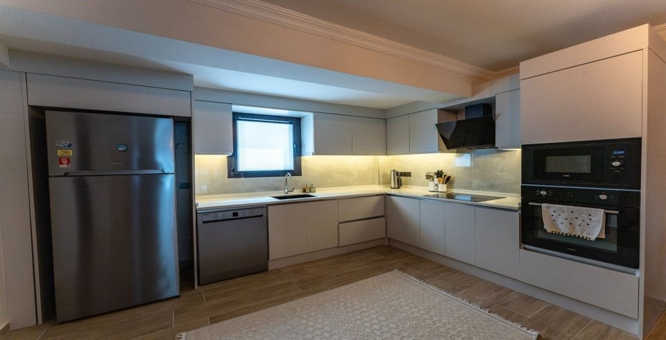 Mutfak: Amerikan mutfak, bulaşık makinası, buzdolabı, ankastre fırın, ankastre 4’lü ocak, su ısıtıcısı, tencere ve tava takımı, yemek takımı, kaşık çatal bıçak takımı, bardak takımı, yemek masası, sandalyeler, çamaşır makinesi. bulunmaktadır.