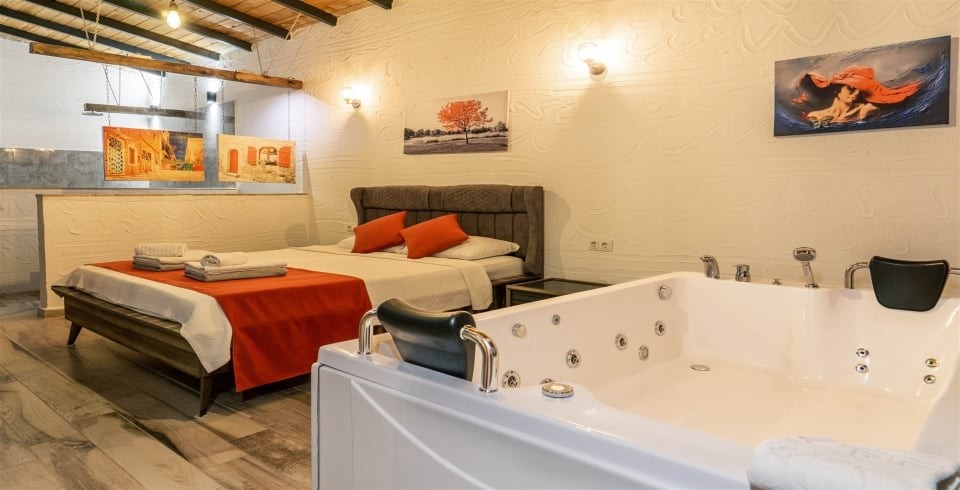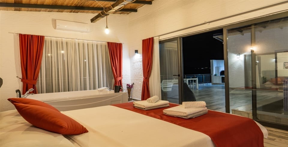 Yatak Odası : 1 adet çift kişilik yatak, klima, elbise dolabı, makyaj masası, komodin, jakuzi, banyo ve lavabo bulunmaktadır.