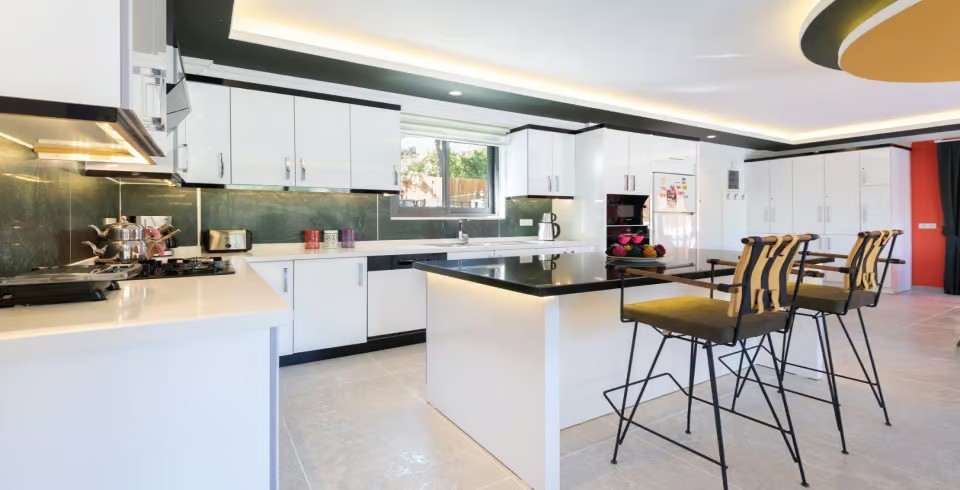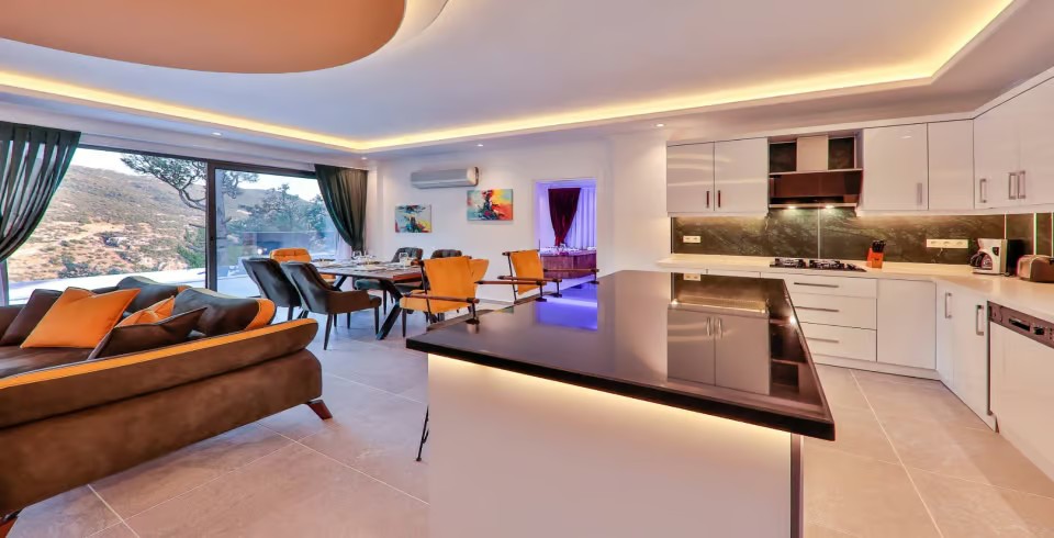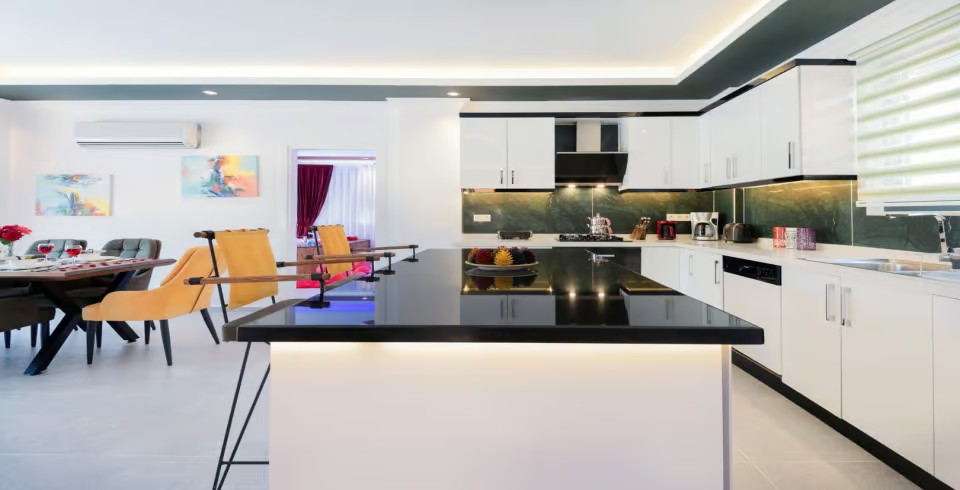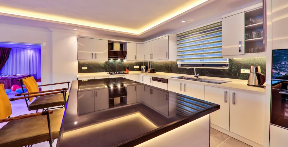 Mutfak :  Buzdolabı, çamaşır makinası, bulaşık makinası, 4'lü ocak ,mikrodalga fırın, kettle, çatal bıçak takımı, yemek takımı, fırın bulunmaktadır.