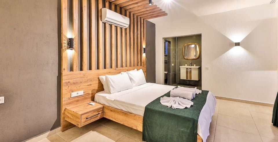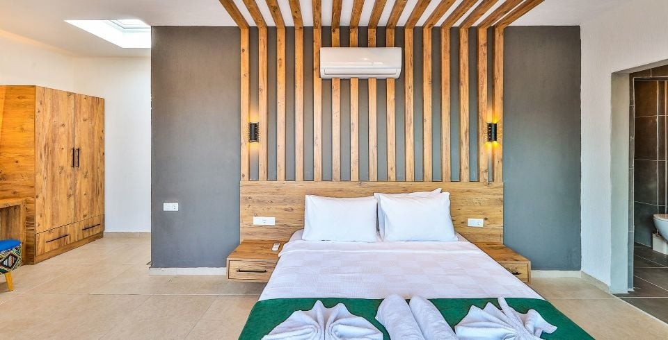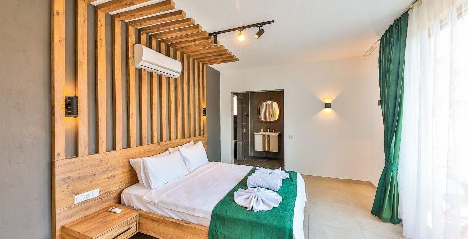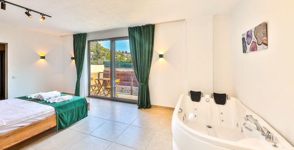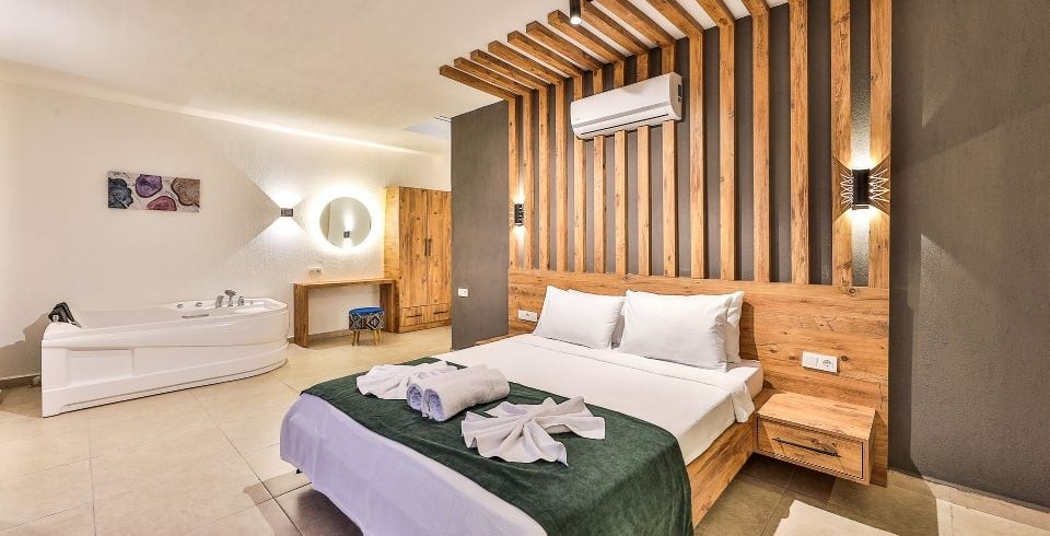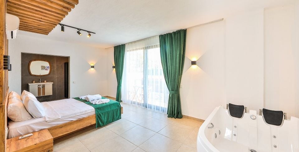 1. Yatak Odası: Çift kişilik yatak, klima, jakuzi, komodin, elbise dolabı, makyaj masası, banyo ve tuvalet bulunmaktadır.