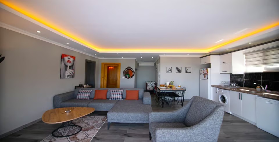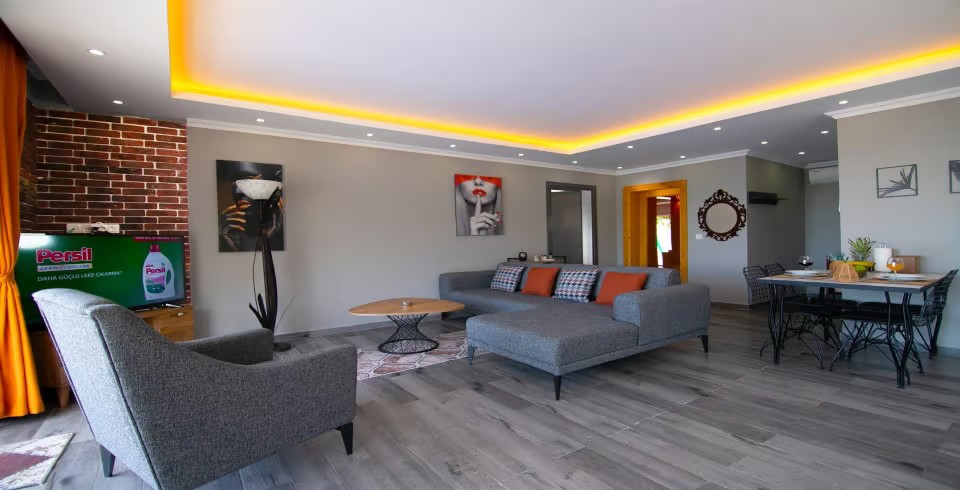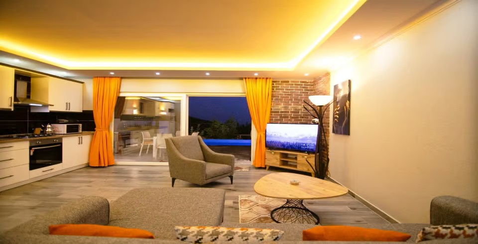 Salon: Villa salonunda konforlu oturma grubu, klima, TV, internet, uydu alıcı, yemek masası, sehpa bulunmaktadır.