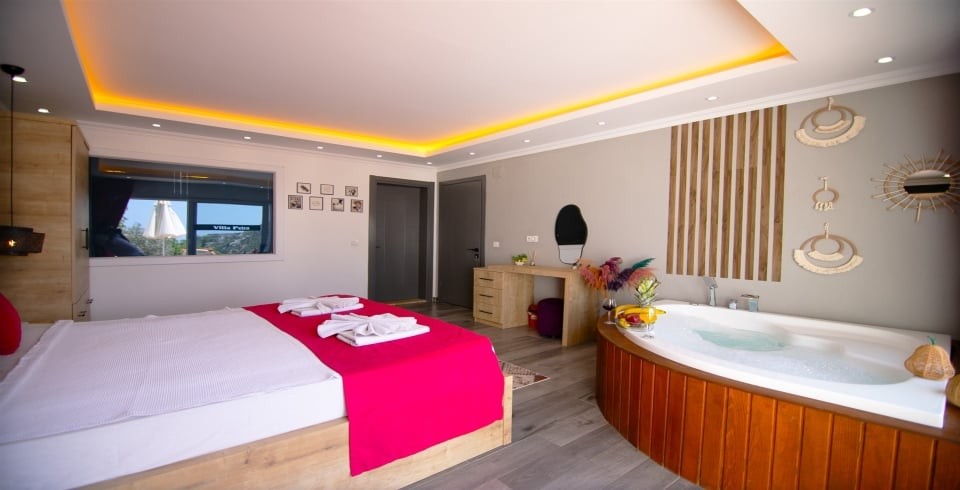 Yatak Odası: Çift kişilik yatak, klima, jakuzi, komodin, elbise dolabı, makyaj masası banyo ve tuvalet bulunmaktadır.