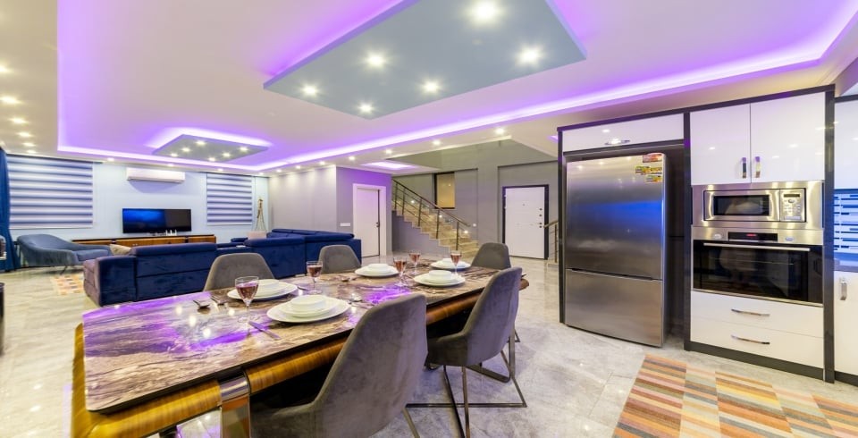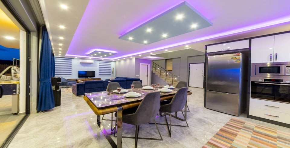 Mutfak : Villamızın geniş Amerikan mutfağı ile sizlere kendi evinizin mutfağı gibi hissettirecek. Ayrıca mutfakta klima, bulaşık makinası, buzdolabı, çamaşır makinası, mikrodalga fırın, tost makinası, ekmek kızartma, su ısıtıcısı, fırın, 4`lü ocak seti ve 6 kişilik geniş yemek masası ile tava tencere vb. mutfak araç gereçlerini kullanma fırsatını sizlere sunuyoruz.