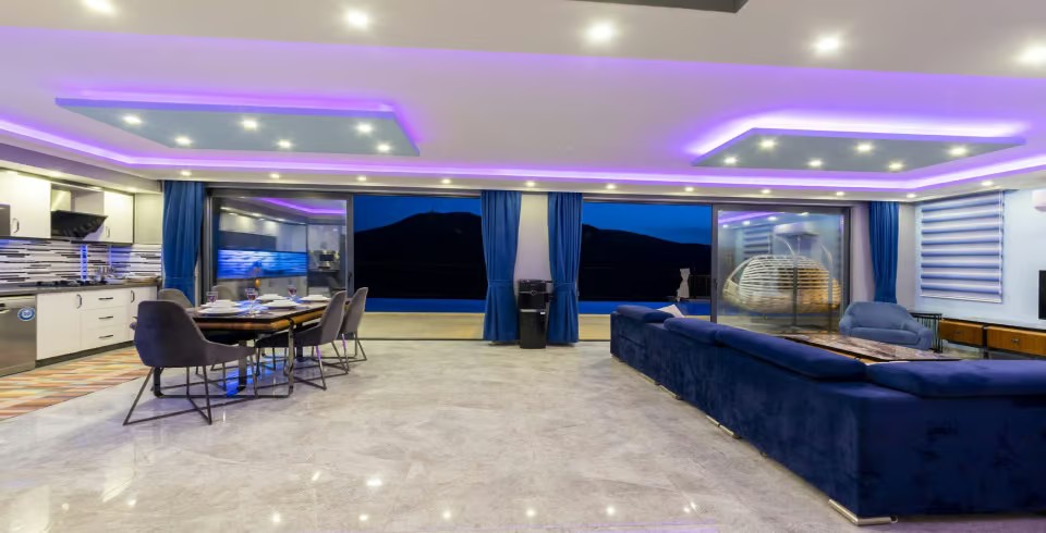 Salon : Villa Pilot’un salonunda sizi şık bir oturma grubu ile klima, televizyon, internet, uydu, koltuk, sehpa ile ferah bir salon bekliyor olacaktır. Havuz terasına çıkış yapılmaktadır.