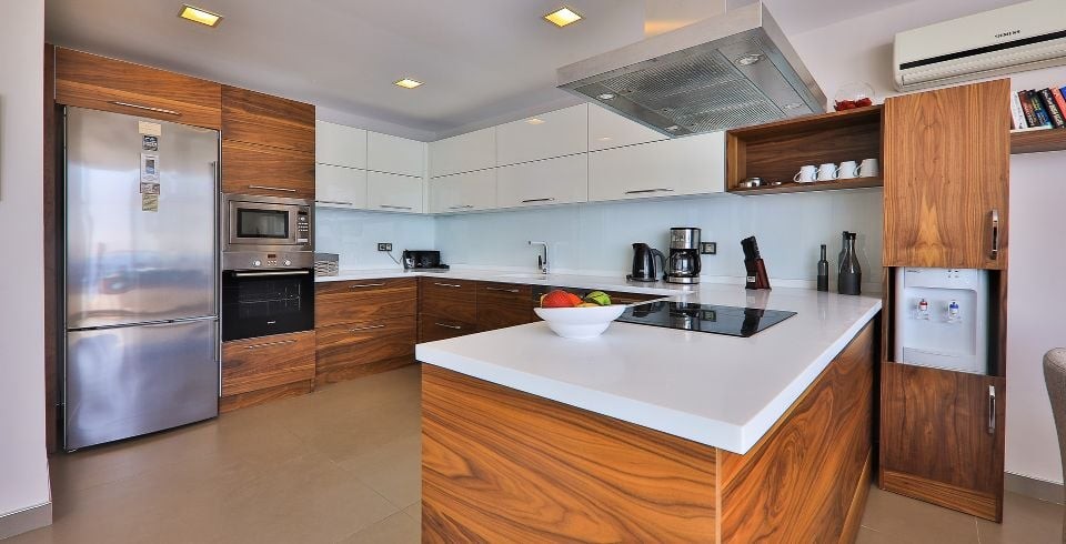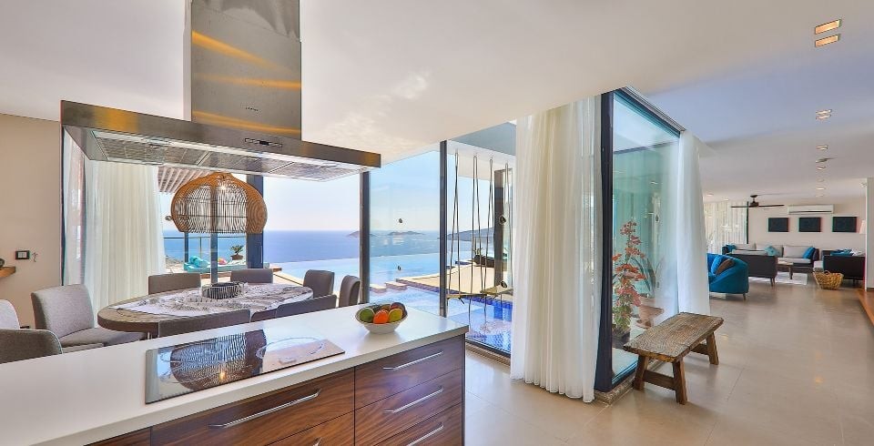 Mutfak : Amerikan mutfak bulunmaktadır. Mutfakta mikrodalga fırın, bulaşık makinası, ankastre fırın, buzdolabı, çamaşır makinası, ankastre 4’lü ocak, elektrikli su ısıtıcı kettle, ekmek kızartma makinası, tencere ve tava takımı, 8 kişilik yemek takımı, kaşık ve çatal seti ve bardaklar bulunmaktadır. Mutfak havuz katındadır.