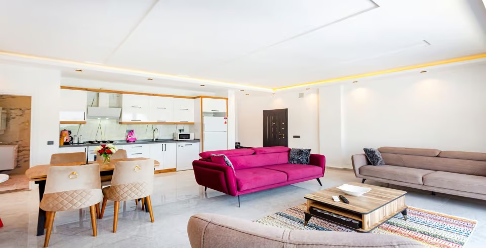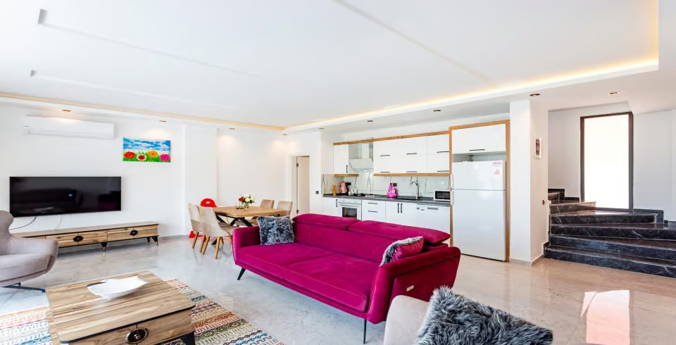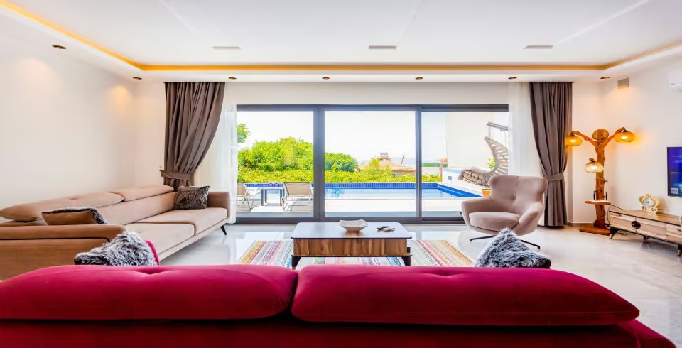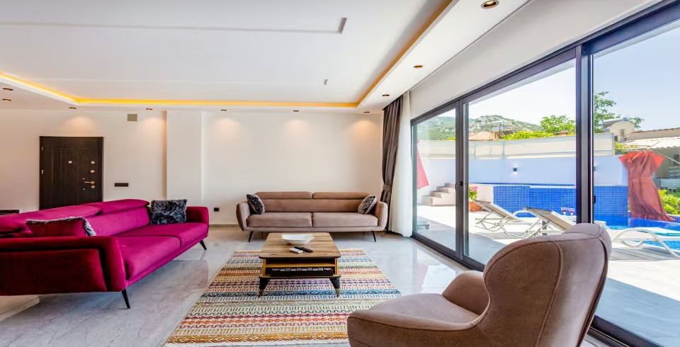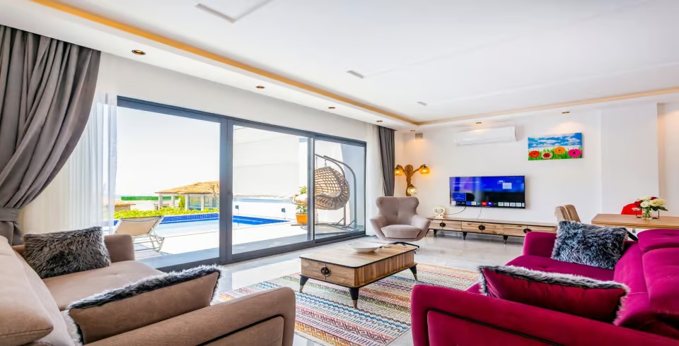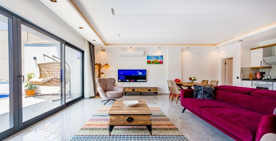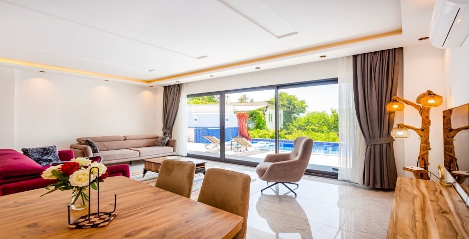 Salon : Salon içerisinde oturma grubu, TV, klima,  sehpa bulunmaktadır. Havuz terasına çıkış yapılabilmektedir.