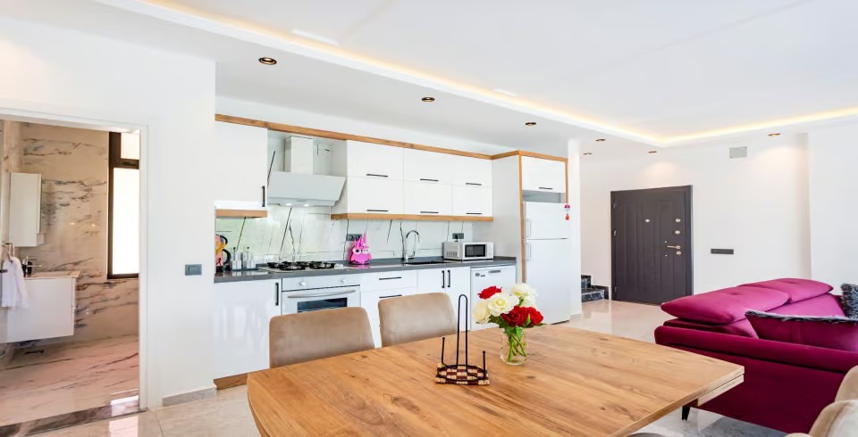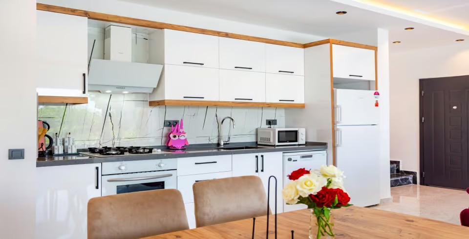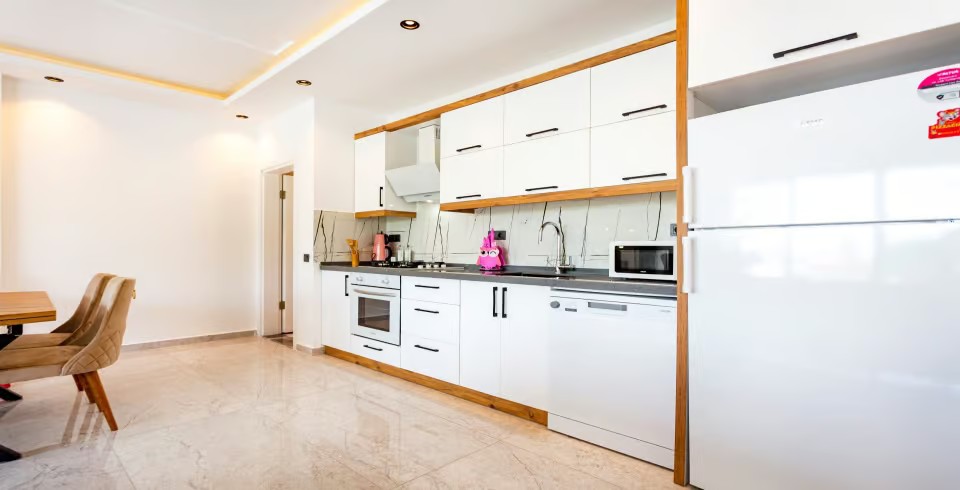 Mutfak : Modern Amerikan mutfak içerisinde 4 kişilik yemek masası, mama sandalyesi, buzdolabı, bulaşık makinası, fırın, ocak, mikrodalga fırın, tost makinası, yemek masası, yemek takımları, çatal ve bıçak takımları, tencere ve tava takımları, bardaklar bulunmaktadır.