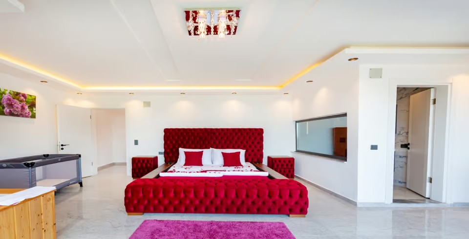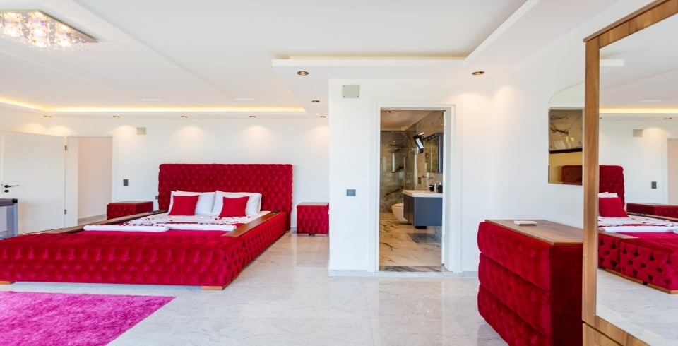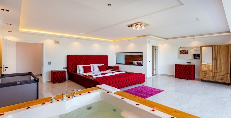 1. Yatak Odası : 1 adet çift kişilik yatak, klima, komodin, elbise dolabı, makyaj masası, jakuzi, banyo ve tuvalet bulunmaktadır.