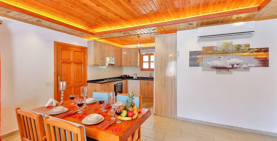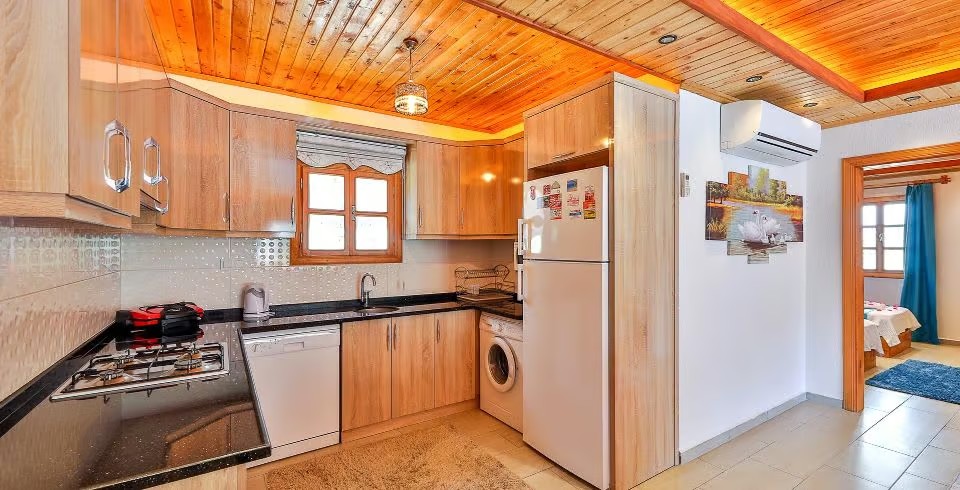 Mutfak: Villamızın geniş Amerikan mutfağı ile sizlere kendi evinizin mutfağı gibi hissettirecek. Ayrıca mutfakta klima, bulaşık makinası, buzdolabı, çamaşır makinası, mikrodalga fırın, tost makinası, ekmek kızartma, su ısıtıcısı, fırın, 4`lü ocak seti ve 4 kişilik geniş yemek masası ile tava tencere vb. mutfak araç gereçlerini kullanma fırsatını sizlere sunuyoruz.