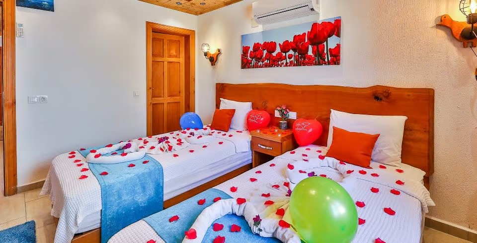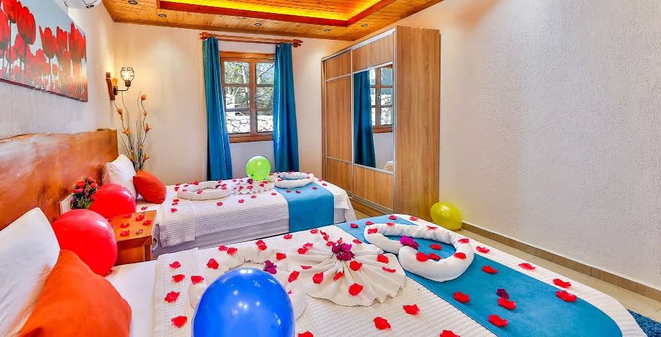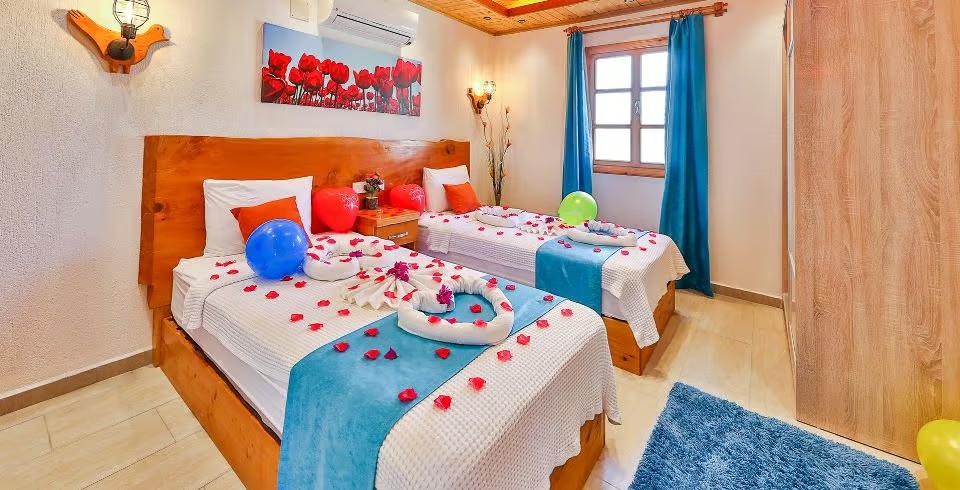 2. Yatak Odası : 2 adet tek kişilik yatak, klima, elbise dolabı, makyaj masası, komodin, banyo ve lavabo bulunmaktadır.