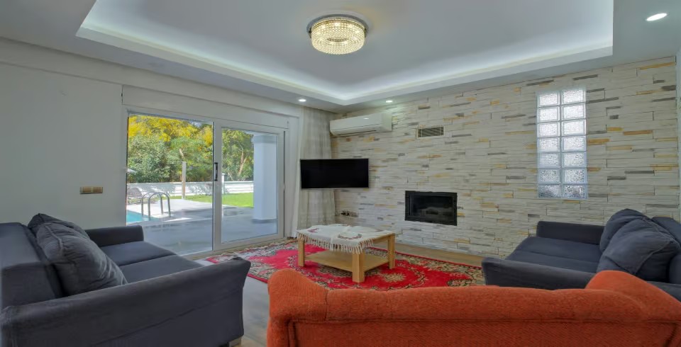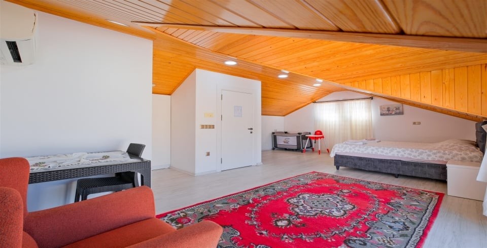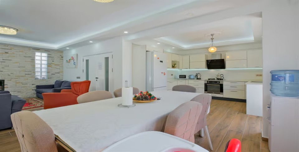Salon : Açık ve modern bir salon, yemek masası, rahat ve modern oturma grubu, uydu alıcı, TV, klima, lavabo, ütü, ütü masası ve lavabo bulunmaktadır.