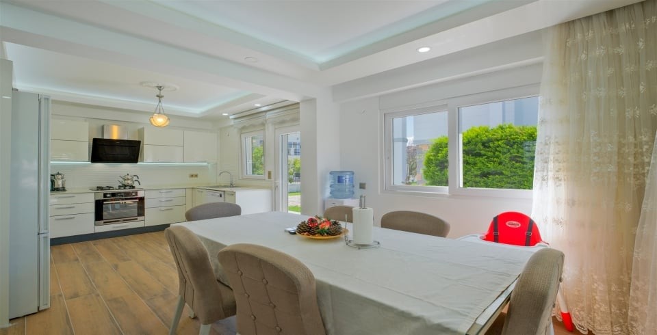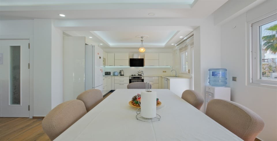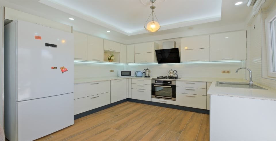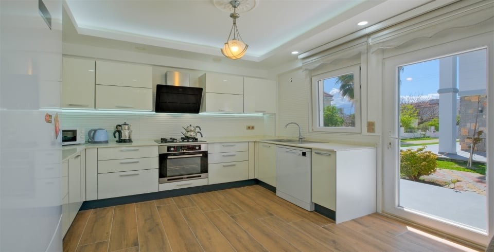 Mutfak : Modern Amerikan mutfak, buzdolabı, bulaşık makinesi, çamaşır makinesi, ankastre fırın, mikrodalga fırın, ankastre 4’lü ocak, elektrikli su ısıtıcısı (ketıl), 8 kişilik yemek takımı, tava, tencereler, çatal, bıçak ve gerekli mutfak araç gereçleri bulunmaktadır.