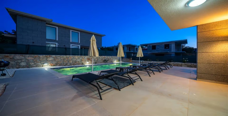 Havuz ve Bahçe : Özel yüzme havuzu bulunan villamızın havuz terasında şemsiye, şezlong, barbekü, pergole, oturma alanı, yemek masası ve sandalyeler bulunmaktadır.