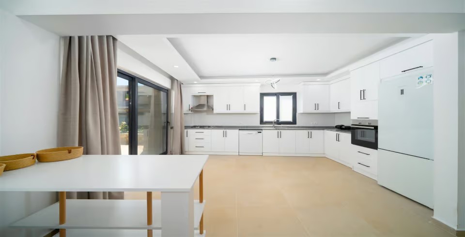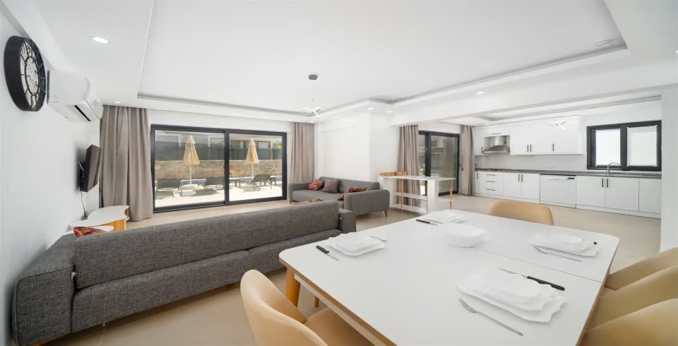 Mutfak : Amerikan açık mutfak ve salona sahip villamızın mutfağında buzdolabı, bulaşık makinası, ankastre ocak, fırın, mikrodalga, 4'lü ankastre ocak, kettle, çamaşır makinası, yemek masası ve mutfak araç ve gereçleri bulunmaktadır.